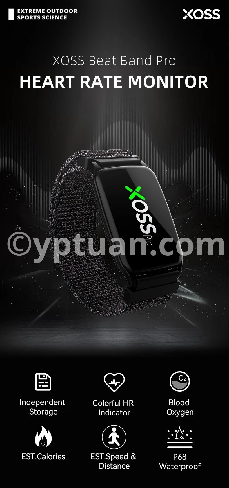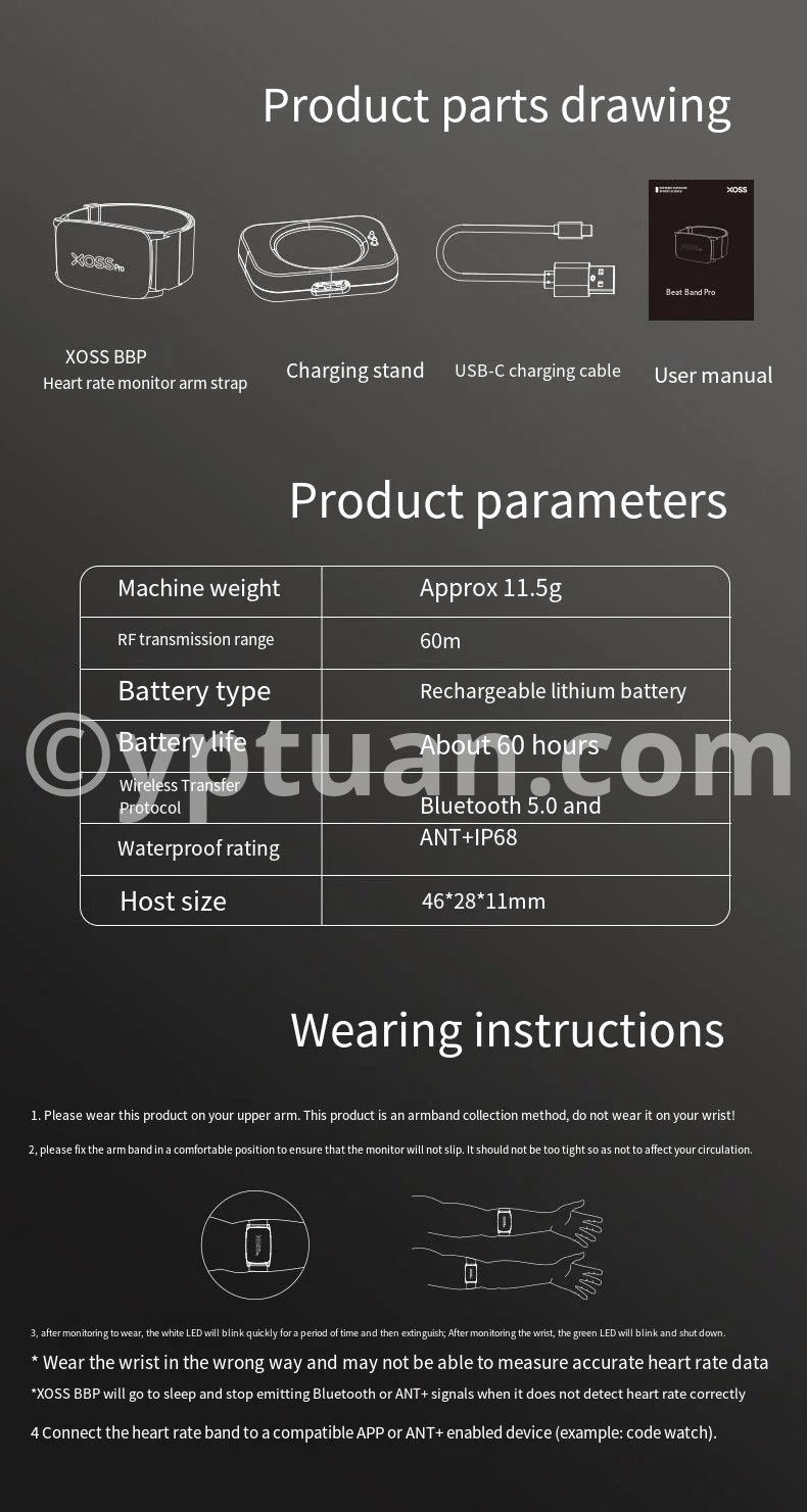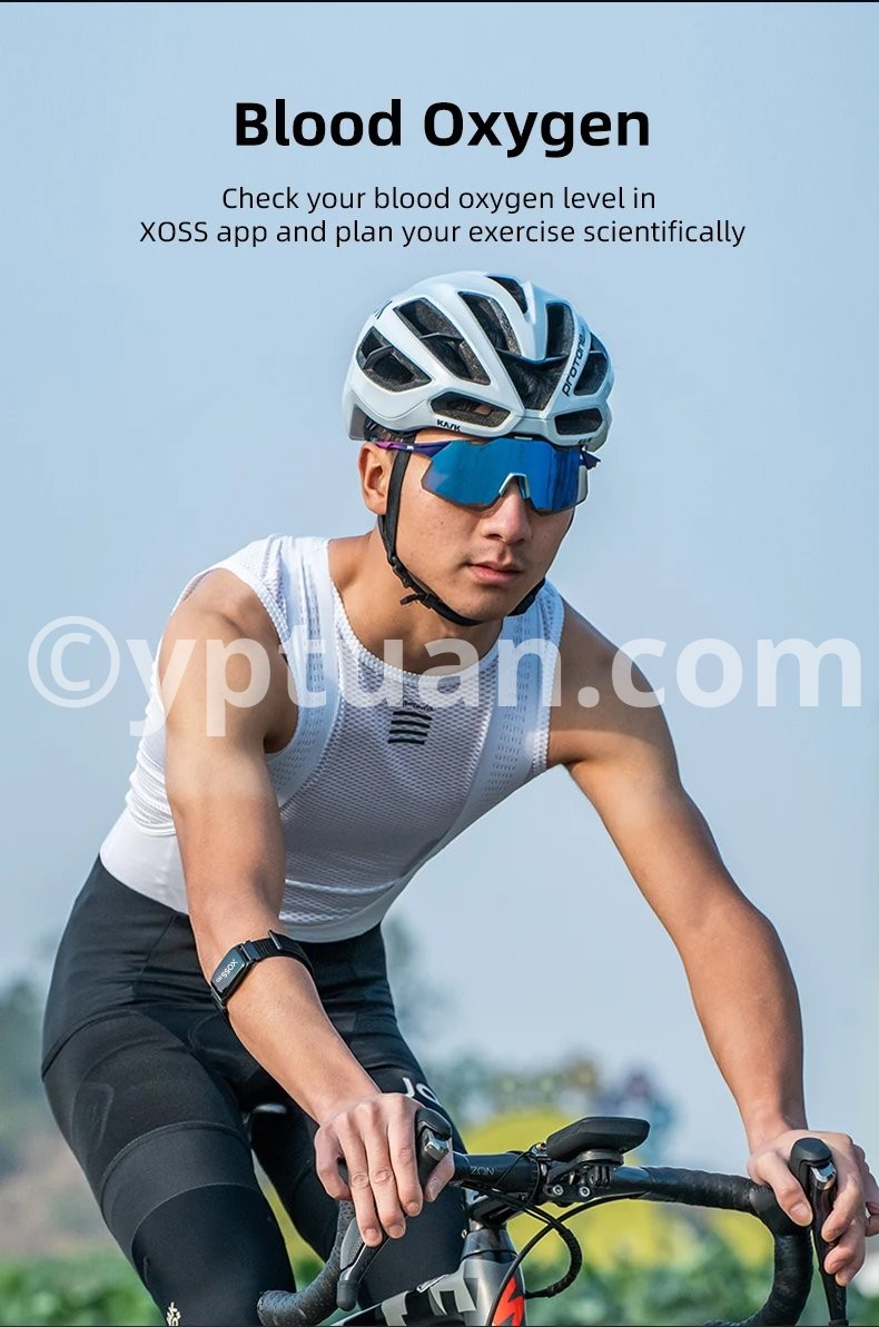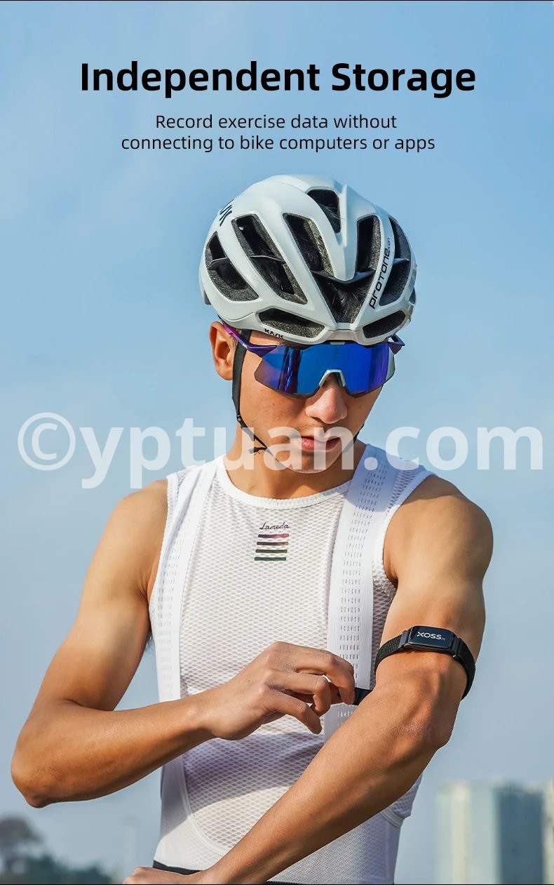 1. Independent Storage: Record exercise data without connecting to bike computers or apps. 2. Colorful Heart Rate lndicator: The indicator light shows different colors according to the realtime heart rate. 3. Blood Oxygen: Check your blood oxygen level in XOSS app and plan your exercise scientifically. 4. Only 11.5g Ultralight Weight, Comfortable to Wear: *Main unit weighs about 11.5g (band not included). 5. Speed/Distance Estimaion: Wih the step counier on,the cadence can be recorded and the speed and distance of movement can be esimated based on the cadence height, gender, and other information. 6. Calorie Estimation: Helps you arrange your exercise and weight management. 7. Heart Rate Alert, Ensure your Safely during Exercise: When your heart rale reaches your preset maximum value,the armband wil fash a red ioht and vibrale to remind you. 8. IP68 Waterproof, Perfect for Swimming(*The unit can be submerged in water up to 1 meter deep for 1 hour without being damaged).