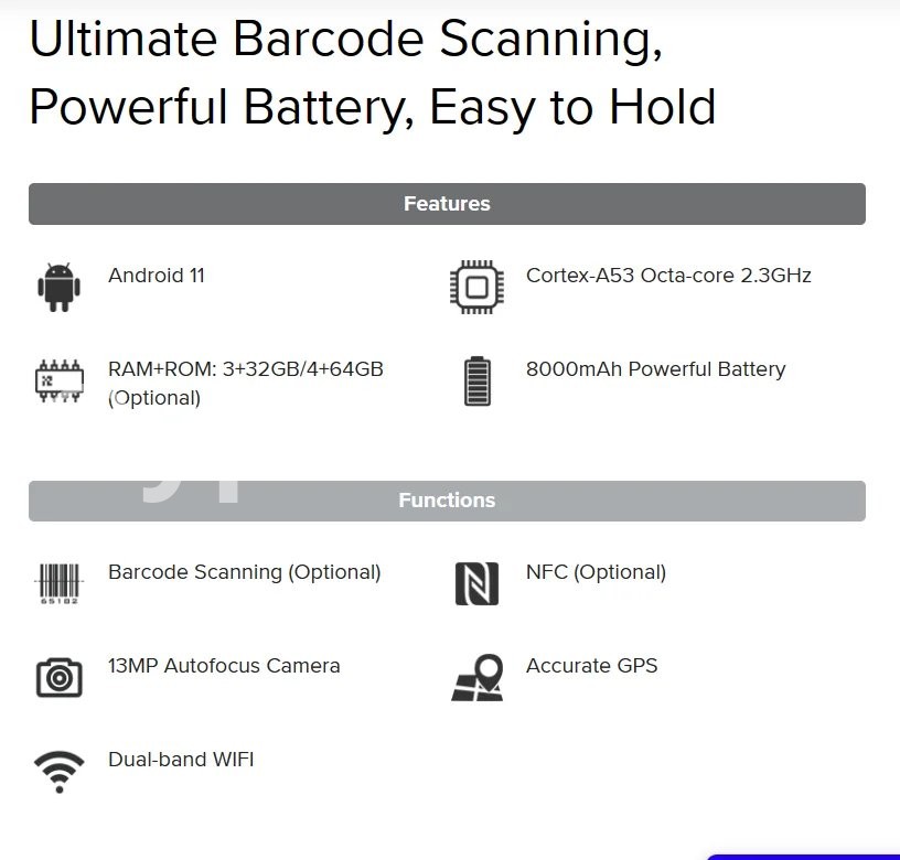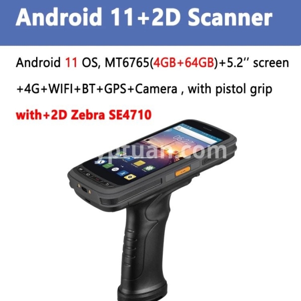 Android 11 MT6765 Cortex-A53 Qcta-core 2.5GHz + 5.2'' Screen + 4G RAM+64GROM + Wifi + BT4.0 + 13MP Camera + GPS + 4G + NFC + SDK+Pistol Grip+2D Zebra SE4710 Scanner