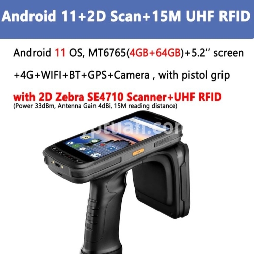 Android 11 MT6765 Cortex-A53 Qcta-core 2.5GHz + 5.2'' Screen + 4G RAM+64GROM + Wifi + BT4.0 + 13MP Camera + GPS + 4G + NFC + SDK+Pistol Grip+2D Zebra SE4710 Scanner+UHF RFID Reader 15M