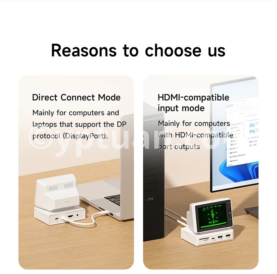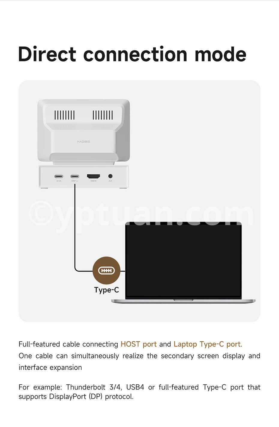 One Cable Connection Mode: USB3.1 Gen2 cable connects HOST port and USB-C port of the laptop, allowing for simultaneous IPS mini screen display and interface expansion. *Note: The USB-C interface of the laptop must be Thunderbolt 3/4, USB4, or a USB-C interface that supports the DisplayPort (DP) protocol in order to use this mode