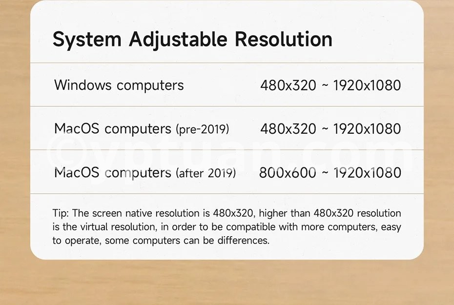 3.5inch IPS Mini Screen:The IPS screen has a wider viewing angle, up to 178 °, providing accurate color presentation from different angles. Windows: 480*320~1920*1080; macOS(Before 2019): 480*320~1920*1080; macOS(After 2019): 800*600~1920*1080. *Note: The native resolution of the IPS screen is 480x320, and resolutions higher than 480x320 are virtual resolutions. In order to be compatible with more computers and convenient to operate, some computers may have differences