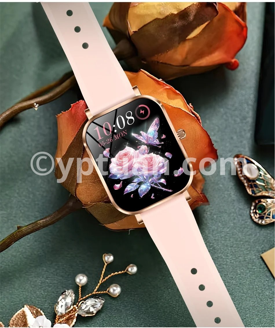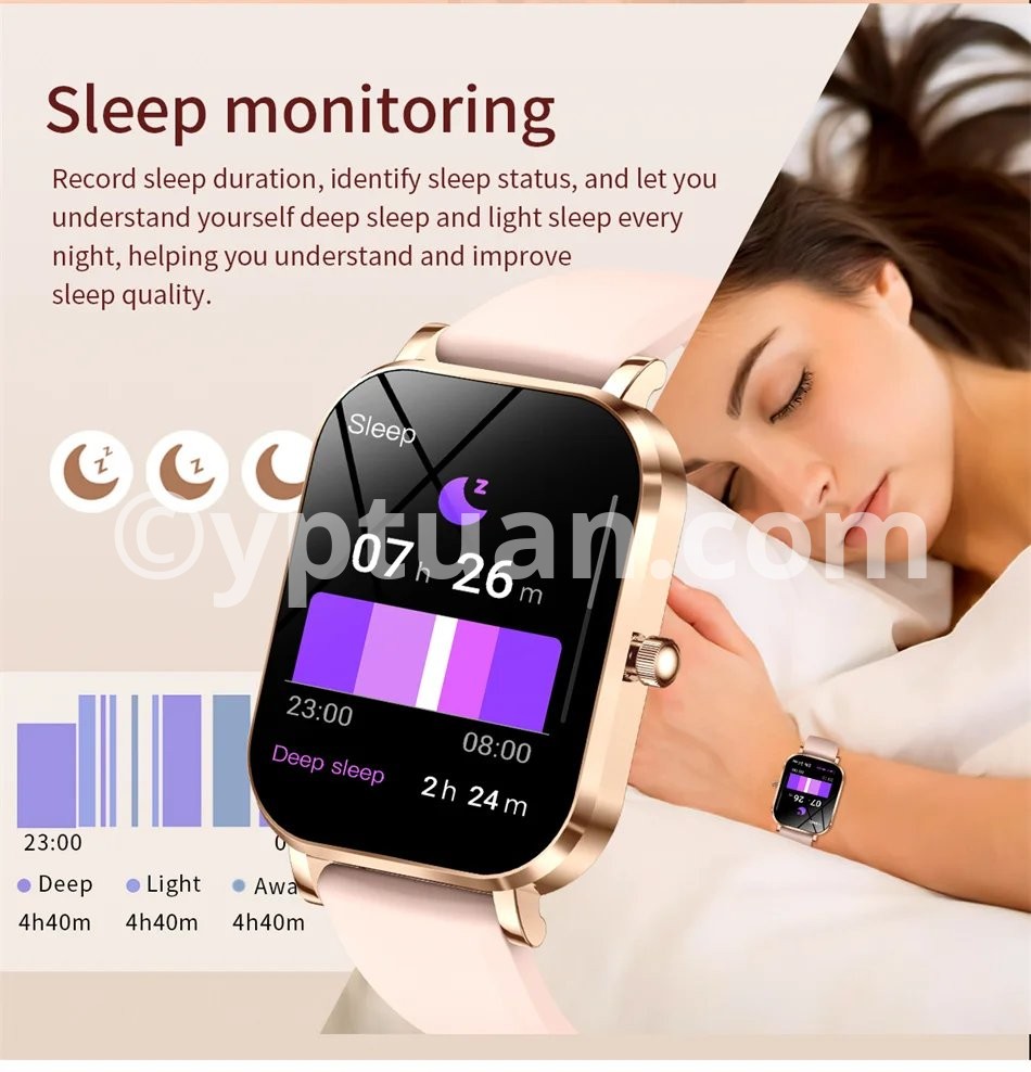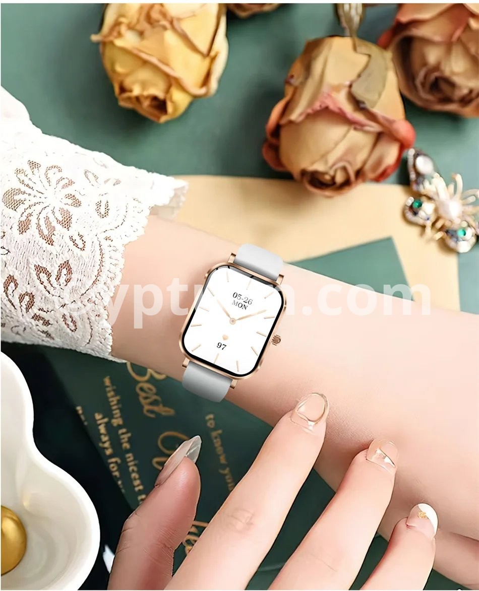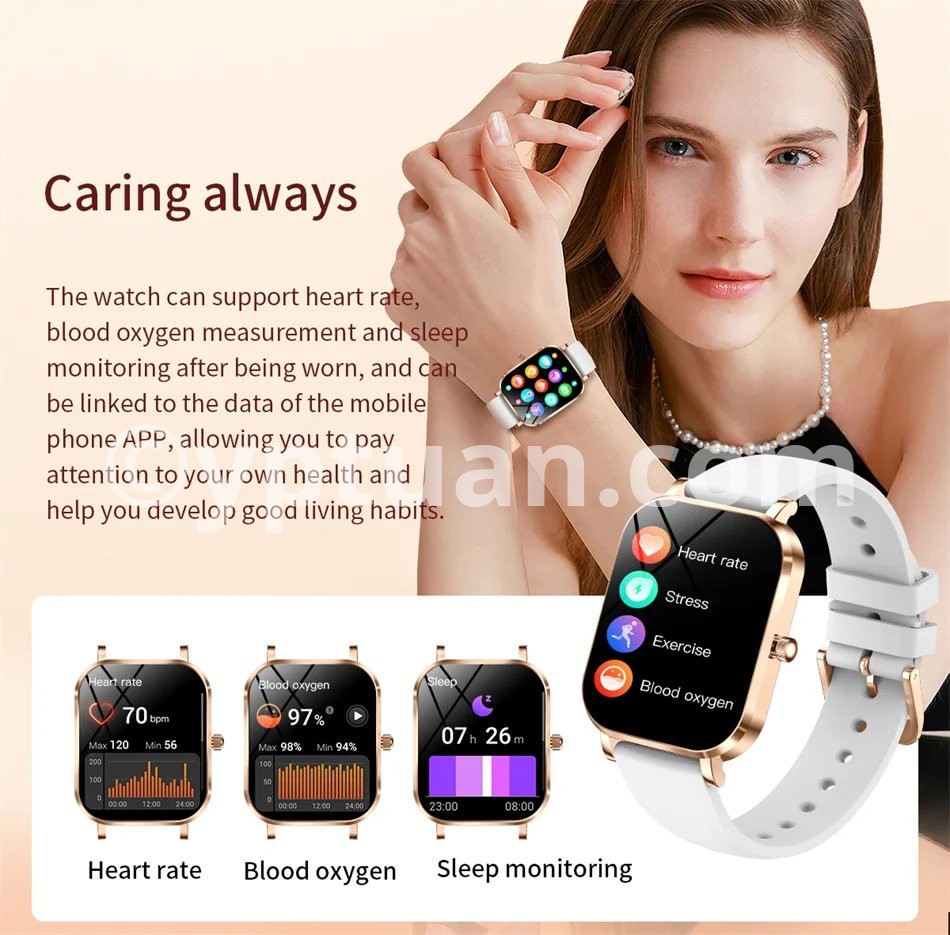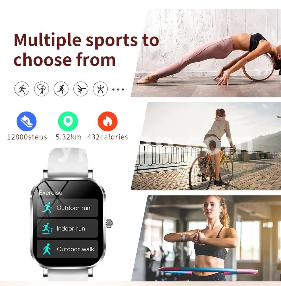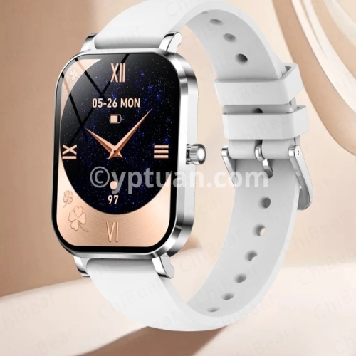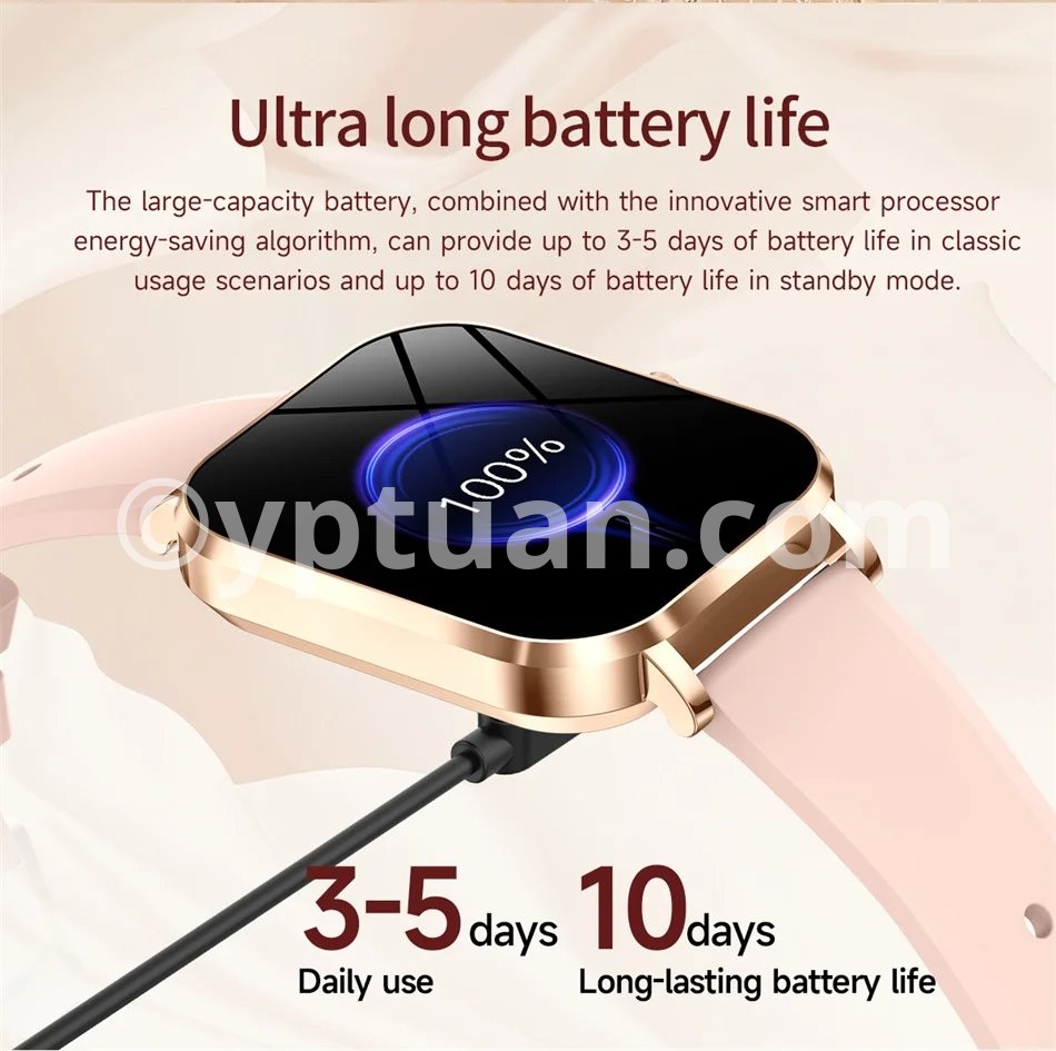 Product selling points 1.IP68 waterproof 2.Multiple health monitoring 3.intelligent alarm clock, female physiology 4.1.75 HD screen 5.Multi-sports mode Product Parameters: Bluetooth: BT5.2 Screen size: 1.75 inch Screen resolution: 240*296 Touch type: full screen touch Battery capacity: 220mAh Charging method: Magnetic adsorption Waterproof level: IP68 APP name: Gloryfit Theoretical standby time: 5-7day Theoretical working time: 3-5day Compatible System: iOS 8.0 or above Android 4.0 or above Product features: Step counting, movement distance, calorie consumption, heart rate detection, blood oxygen detection, weather forecast, voice assistant, Bluetooth call, Bluetooth music, multi-movement mode, SNS message reminder, sleep detection, stopwatch, timer, alarm clock, breathing training, mobile phone search, sedentary reminder, intelligent alarm clock, female physiological reminder, mini-game, etc. languages: *Watch languages:The watch supports 19 languages (Chinese, English, Korean, Japanese, German, Spanish, French, Italian, Portuguese, Arabic, Hindi, Polish, Russian, Dutch, Turkish, Thai, Vietnamese, Filipino and Malaysian); Watch push supports 140 languages
