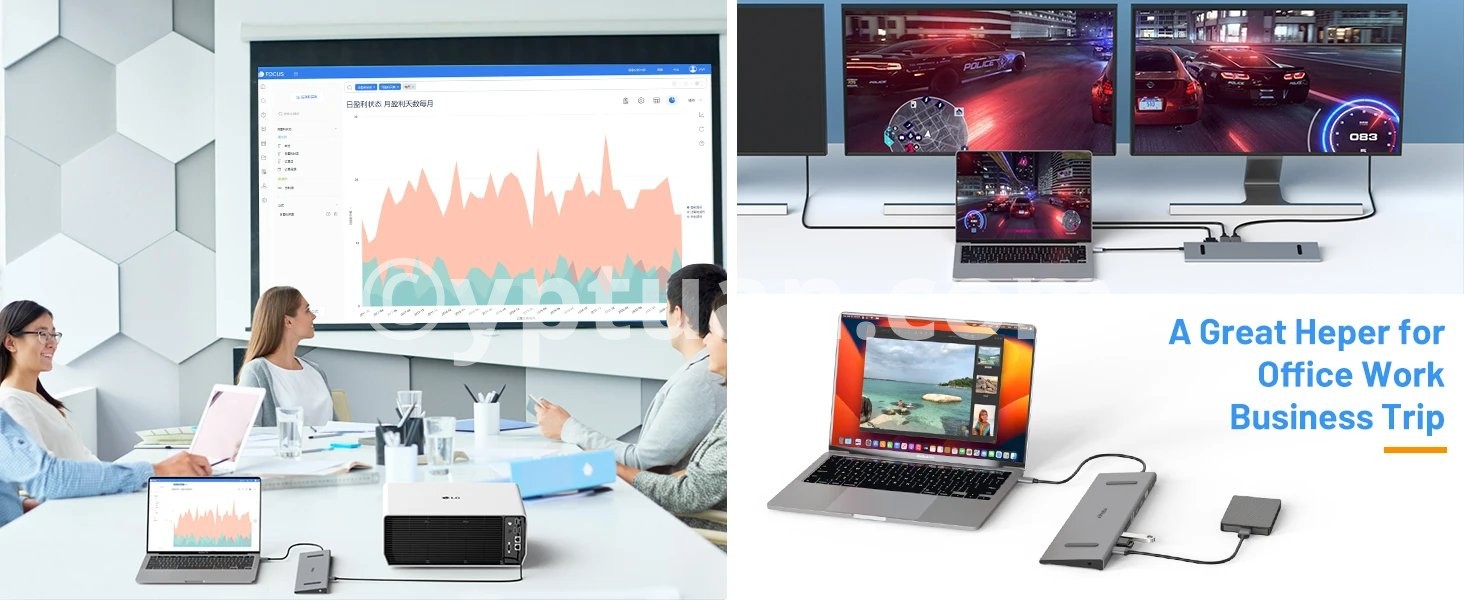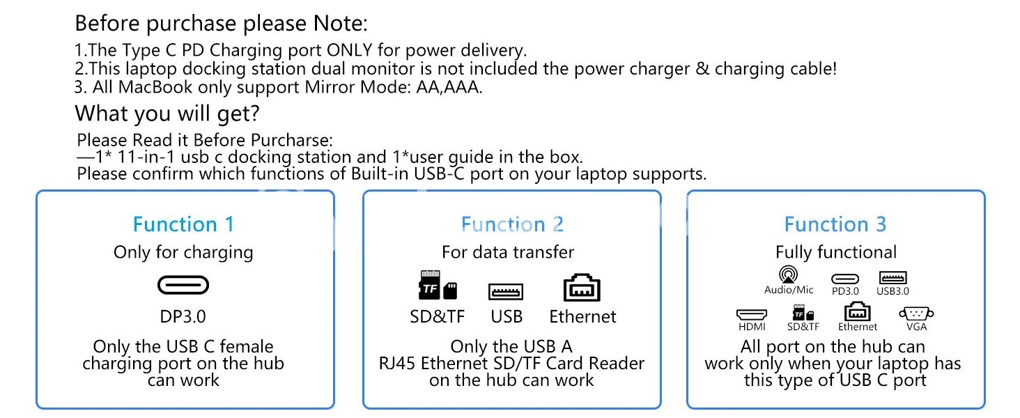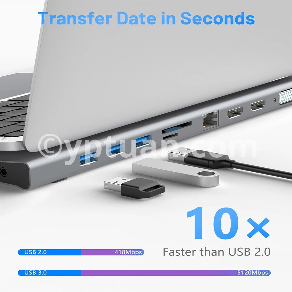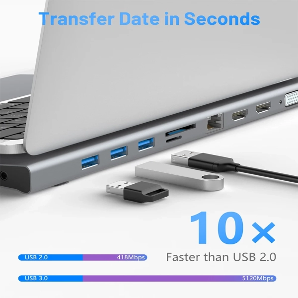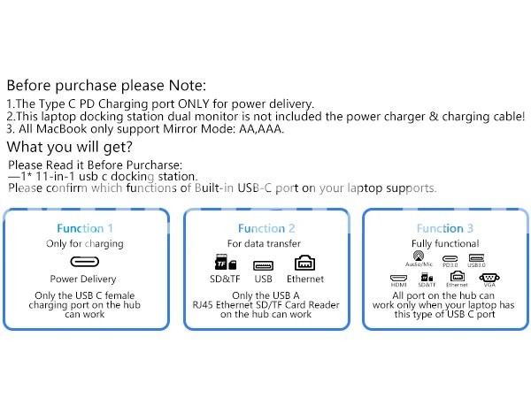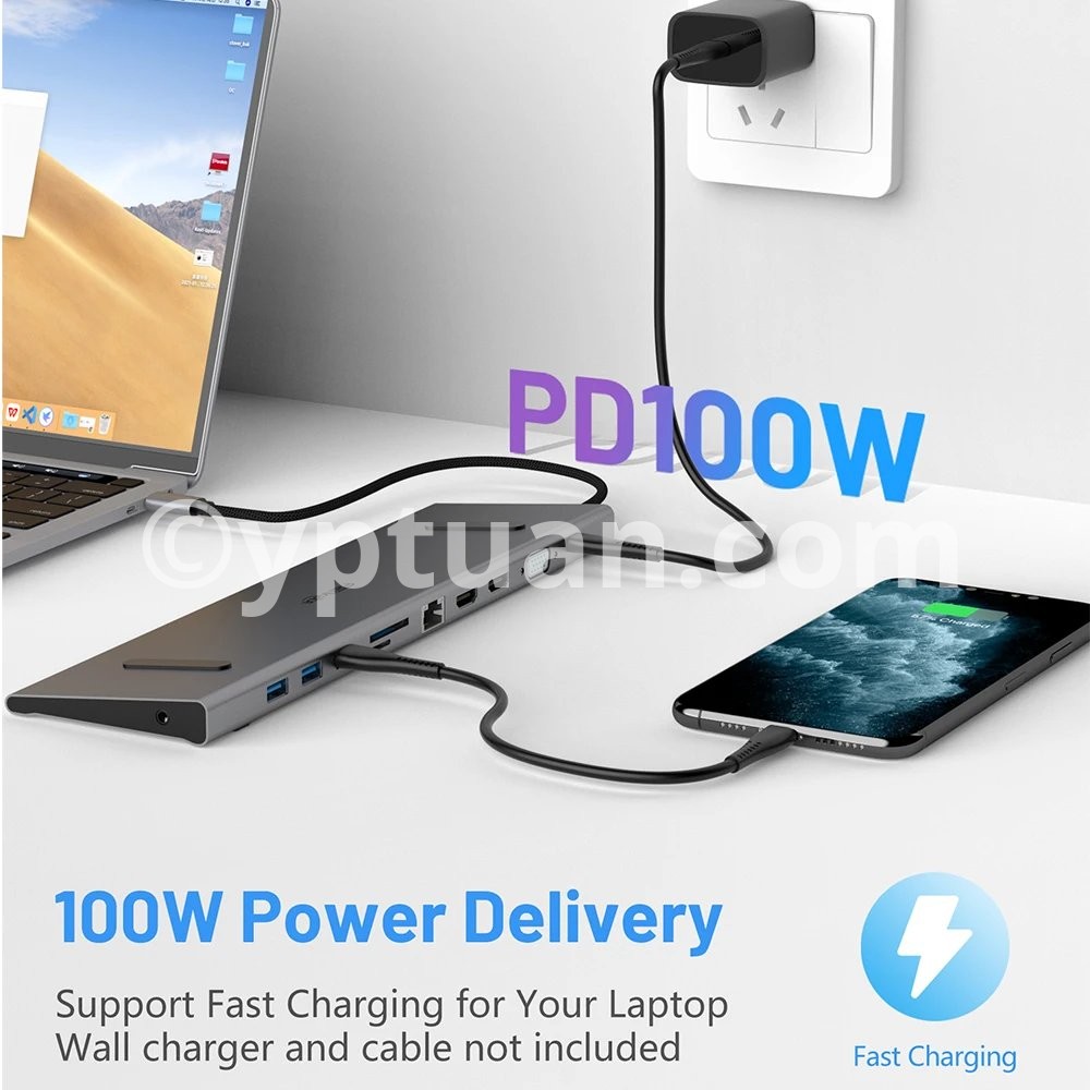 Fast Charging: Our laptop Docking Station equipped with 100W USB C power delivery port, greatly reduce the charging time of your laptop, no need to worry about losing laptop's power when usb c docking station fully loaded. It would be better to plug the laptop's charger into the PD3.0 port to ensure all ports are functioning properly.