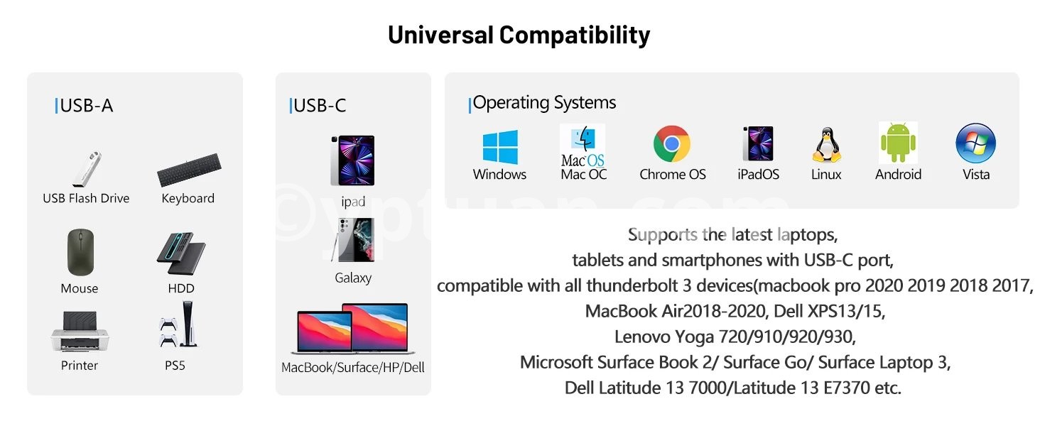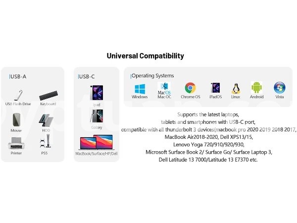 Wide Range of Compatibility: USB C dongle supports the latest laptops, tablets and smartphones with USB-C port, compatible with all thunderbolt 3 devices(macbook pro 2020 2019 2018 2017, MacBook Air2018-2020, Dell XPS13/15, Lenovo Yoga 720/910/920/930, Microsoft Surface Book 2/Surface Go/Surface Laptop 3, Dell Latitude 13 7000/Latitude 13 E7370 etc. More details, please check on the detail page before purchase