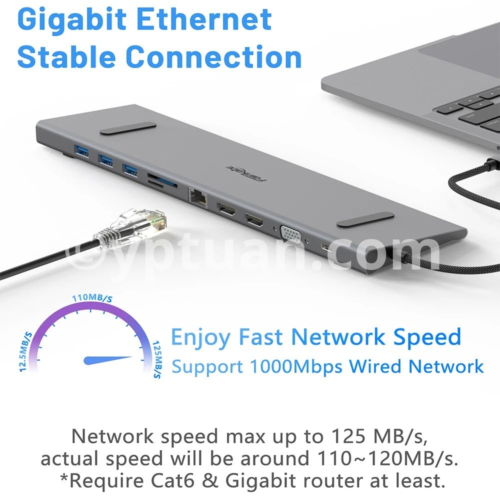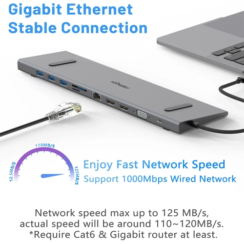 USB C to Gigabit Ethernet Adapter and Mic/Audio Port: The USB C hub multiport adapter supports 10/100/1000Mbps Wired Network, you can enjoy the ultra-fast gigabyte ethernet speed and the reliability of a wired connection directly. Also, this usb c docking station have a 3.5mm Mic/Audio(2 in 1) port for you to put in your wired headset, so that you can enjoy music and no worried to bother others.