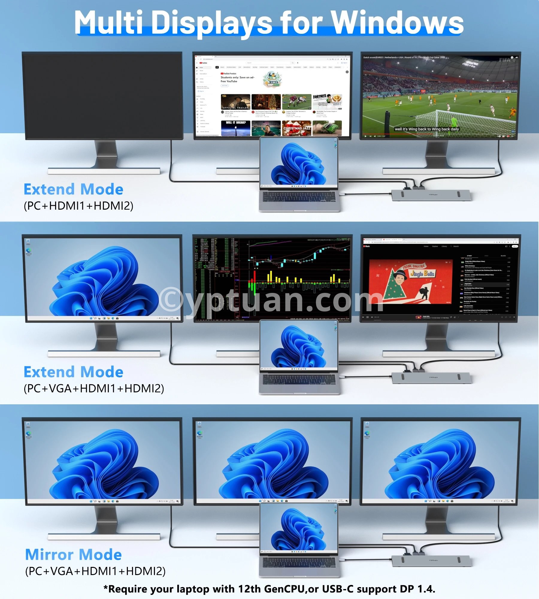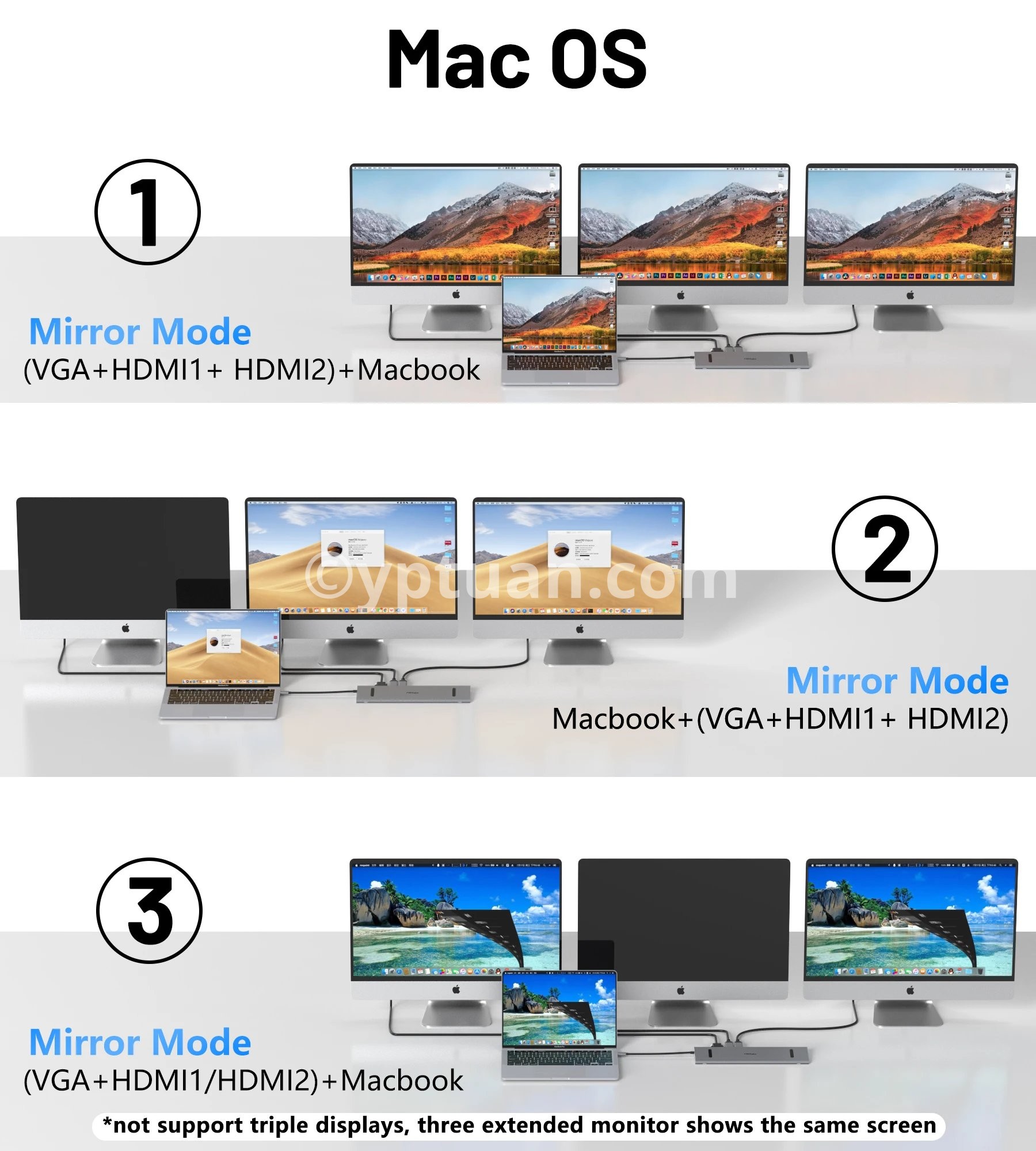 USB C Docking Station Dual Monitor: Windows system support MST and SST(Mirror & Extend Mode). Single use or dual HDMI can up to 4K under DP1.4 source. HDMI resolution will be 1080P@60Hz when dual or triple display with VGA. Please note: Mac OS DOES NOT support triple display, it only support mirror mode and non-mirror mode. Non-mirror mode means that the three external monitors are same but different from laptop.