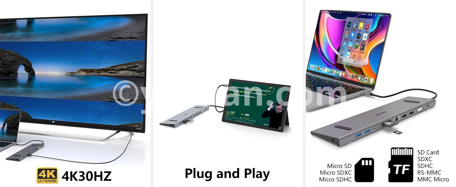 Massive Expansion & Laptop Standstick: Our USB-C hub equipped with a USB-C Power Delivery input port, a VGA port, 2 HDMI(4K) ports, 3 USB(3.0) data ports, 1 audio/mic port, an Ethernet(10/100/1000Mbps) port, and a microSD/SD card reader, giving you an incredible range of functions—all from a single USB-C port, with compact one-body aluminum shell, 15° bevel and the anti-slip silicone mat, offer you stable always, comfortable, no matter where you are, ready for your journey.