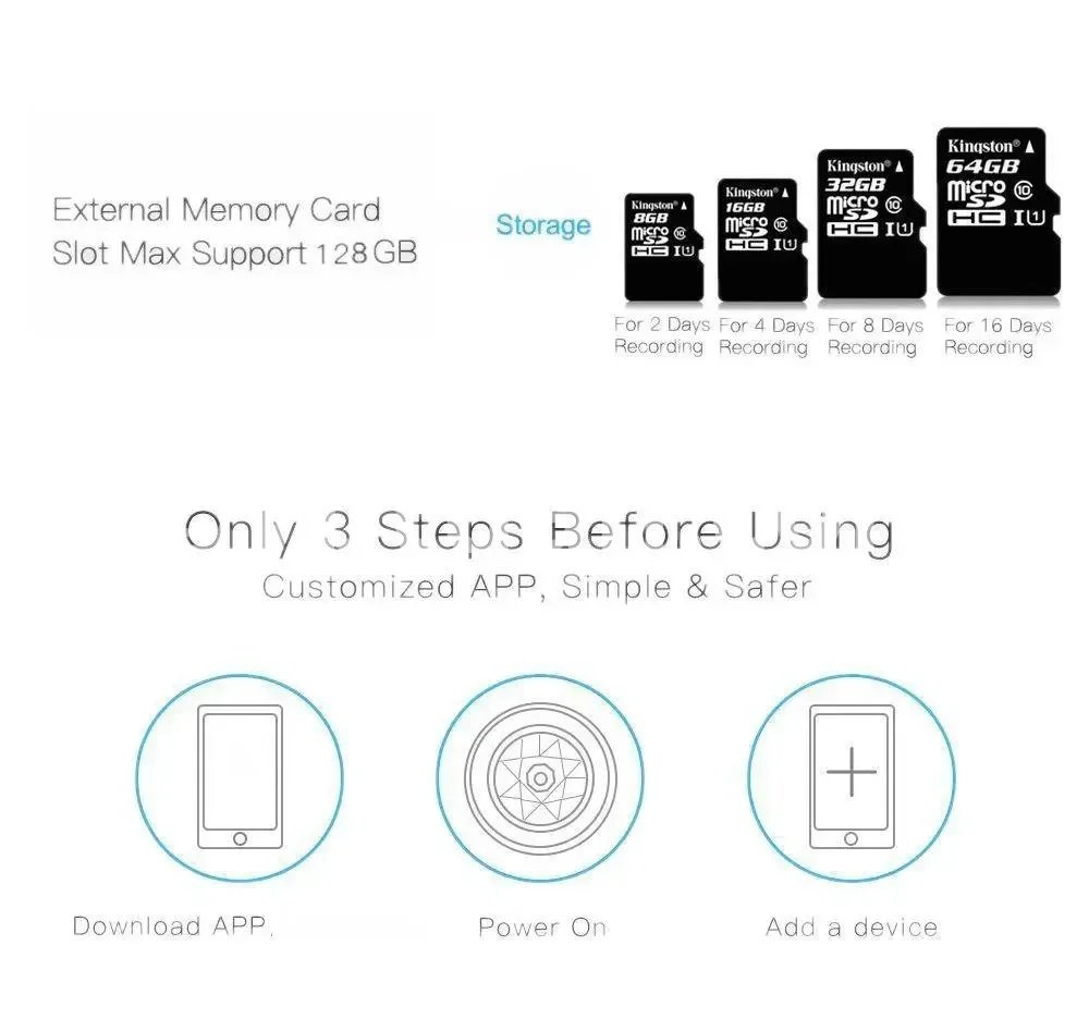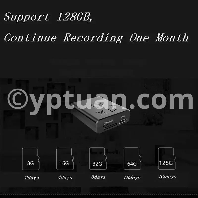 sensor:BF3A03 Focal length:3.2mm View Angle:90° Main control chip:BK7252UQN68 memory:Support TF Card, up to 128GB(not included) USB (interface):Micro USB2.0 5PIN voltage:3.7V Image Resolution :1280*720P File format:JPG video resolution:1080P/720P/640P(APP) video (compression) format:AVI(M-JPEG) Continous Video Recording Time:Video Recording no limited Operating Temperature: -10~50℃ WIFI distance: 10 meter(AP) , Remote no limited night vision distance: 3-5M Storage Temperature: -10~70℃ Humidity environment:5%-90%(No condensation) Please note: you can buy it with TF card or without TF card. We only guarantee that the memory card purchased from us can function properly. We do not guarantee that the memory card you purchased from elsewhere can also be used effectively. To avoid unnecessary issues, we suggest that you purchase our memory card. thanks