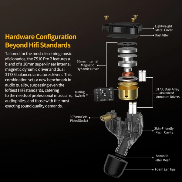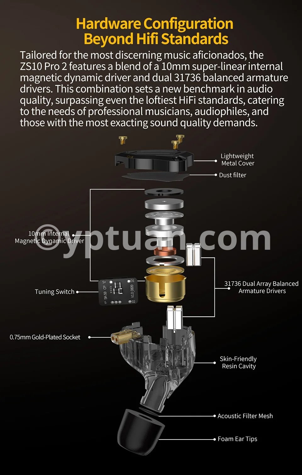 KZ ZS10 Pro 2 Metal Earphone HIFI In Ear Bass Earbud 4-Level Tuning Switch Headphone Sport Monitor Sound Noise Reduction Headset