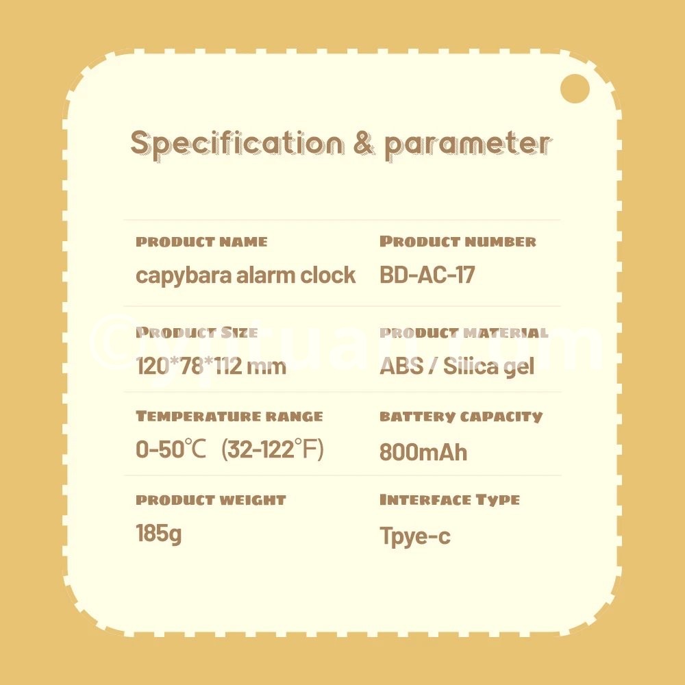 Function: 1. Type-C charging port, convenient for charging 2. Night light function Adjustable light duration 3. Adjustable time brightness and volume 4.Brightness can be adjusted, and can be adjusted manually 5. Touch snooze. When the alarm sounds, you can touch the top to snooze, the snooze time is 5 minutes 6. Always-on display Switch to the “always-onmode”,the display keeps on. Switch tothe "Energy saving mode",will be off after 8 seconds.After entering the energy saving mode,touch the top button to wake up the display. 7.Battery status display When charging --- always on Fully charged---off Low battery---flashing Product Show: Material: ABS,Silicone Product size: 120 * 78 * 112mm Color: yellow Accessories: Chinese/English manual, data cable