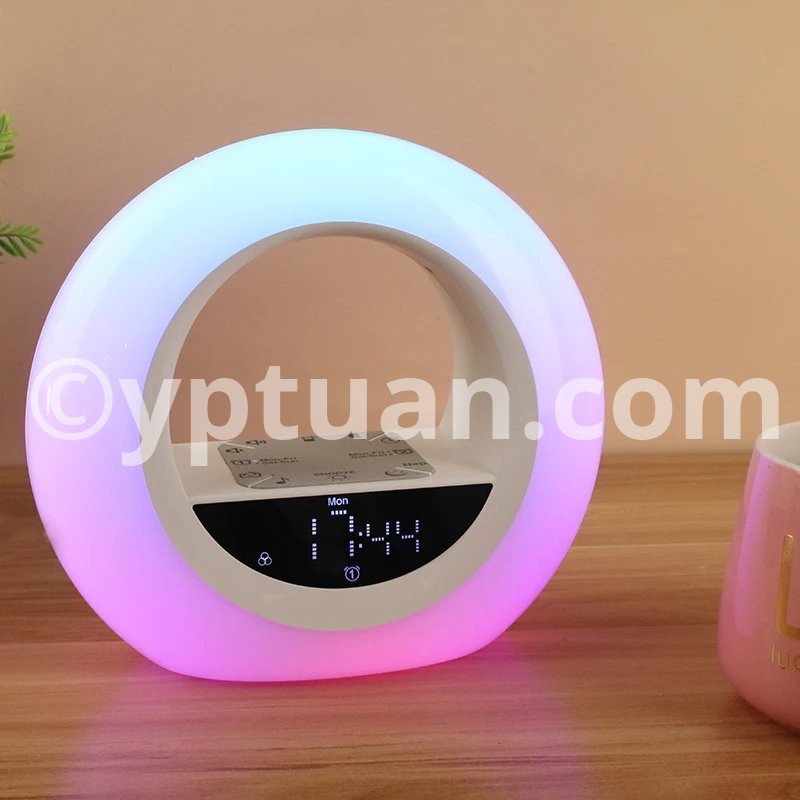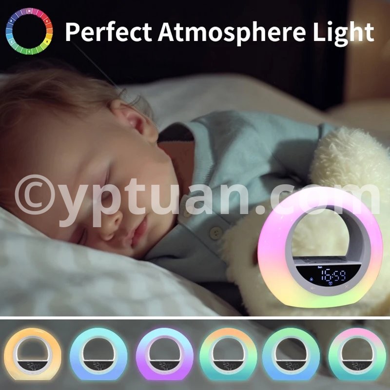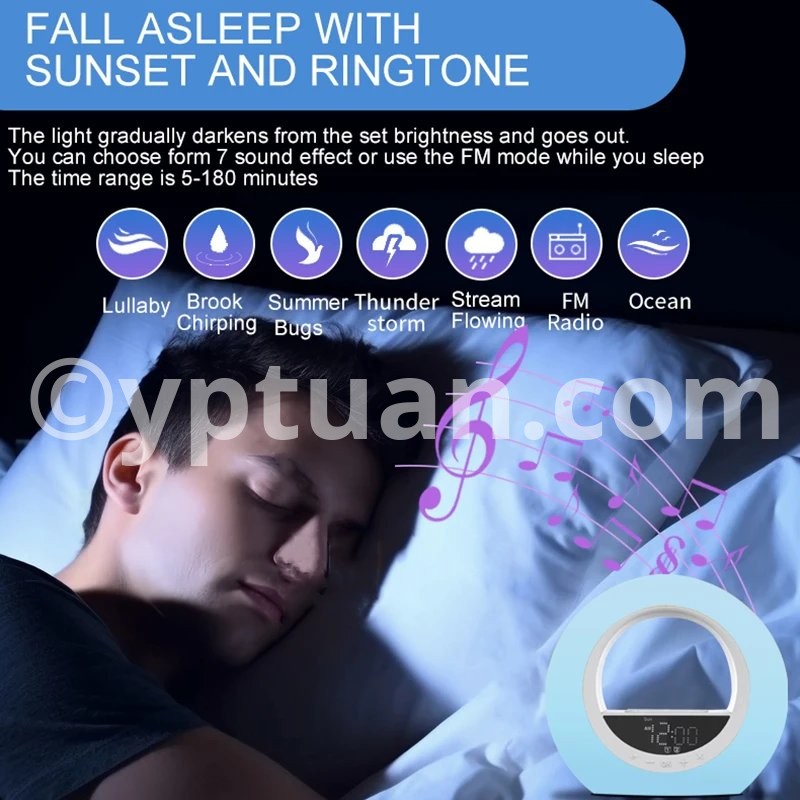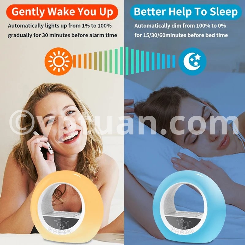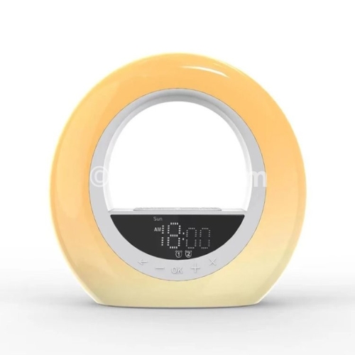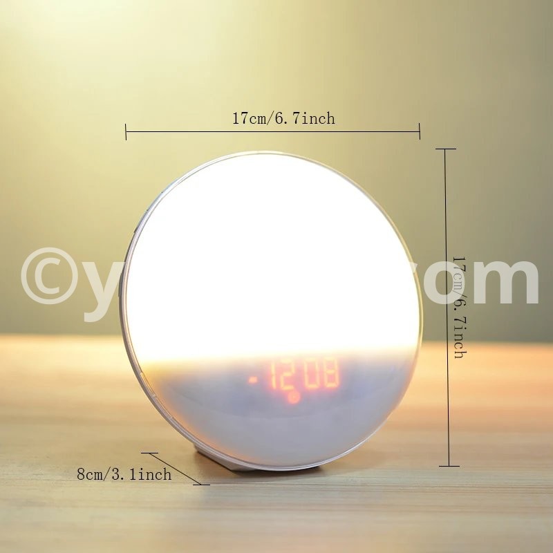 Product Features: 【Wake Up Light with Sunrise simulation】This Sleep Aid digital alarm clock is designed for everyone. in fact, especially for heavy sleepers and kids. Sunrise simulation light with 7 natural sounds &FM Radio will be on gradually from 10% brightness to 100% before alarm setting time,you can set the process to 60 minutes or 10 minutes. Wake you up by nature. 【Dual Alarm Clock & Snooze supported】Considering you may need to set up different alarms for your family member, we designed 2 alarms for you. Also, the function of snooze is specially designed for those who needs an extra 9 minutes to start a fresh day. You just need to press the "Snooze" button at the top of the clock, you will get more 9 mins to sleep. 【Sleep Aid with 3 Sleep Sounds&FM Radio】 This natural light alarm clock glows a soft night light and/or plays natural sound with an auto- off timer to help you or kids fall asleep more peacefully. You can also adjust clock display brightness or turn it off. 【7 Color Light & 20 Brightness Adjustable】 There are 7 color changing light you can choose, include blue, indigo, purple, red, orange, yellow, green. 3 level LED time display brightness & 20 level lighting brightness adjustable. 【Night Light & Bedside Lamp】It is also a Bedside Lamp / Night Light / Reading Lamp. It will be a bedside lamp / night light / reading lamp just when you press the button on the upper left to switch it on. Also you can Rotary the button to adjust the brightness. Soft and warm lighting gives you good sight when you feed your baby / go to the toilet / read a book at night. 【USB port for charging or Power Supply】This USB can provide stable current which won't hurt the device attached and can all device attached can use at the same time. 【Time】 LEDs digits to display time, easy and convenient for reading. 【Note】This clock is a plug-in model, using the DC cable. No adapter. Product function USB port for charging or Power Supply Multiple sets of alarm Dual alarm can be set for workday and weekend Snooze Coloured Sunrise simulation Coloured Sunset simulation Time display FM Radio Specification: Lampshade material: Plastic Item color: white Light color: RGB Power interfaceInput Voltage : USB5V/2A USB Output:5V/1A Package includes: 1 x Wake-up Light Sunrise Alarm Clock 1 x User Manual 1 x USB Cable Rainbow Light