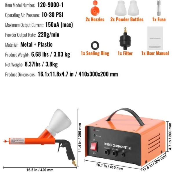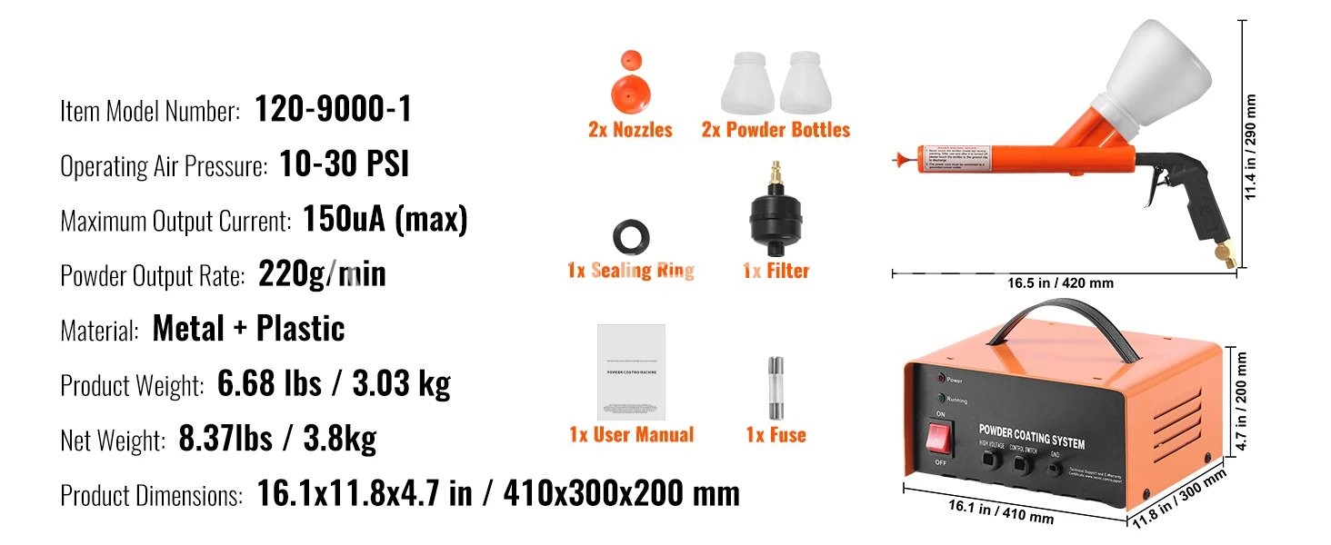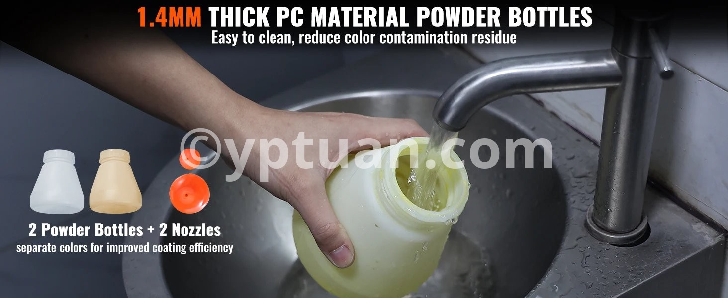 2 Powder Bottles and Nozzles: Easily switch between colors without the hassle of cleaning between powder changes. Each bottle is dedicated to a specific color. Our powder coating kit reduces the risk of color contamination due to incomplete cleaning and significantly improves work efficiency.