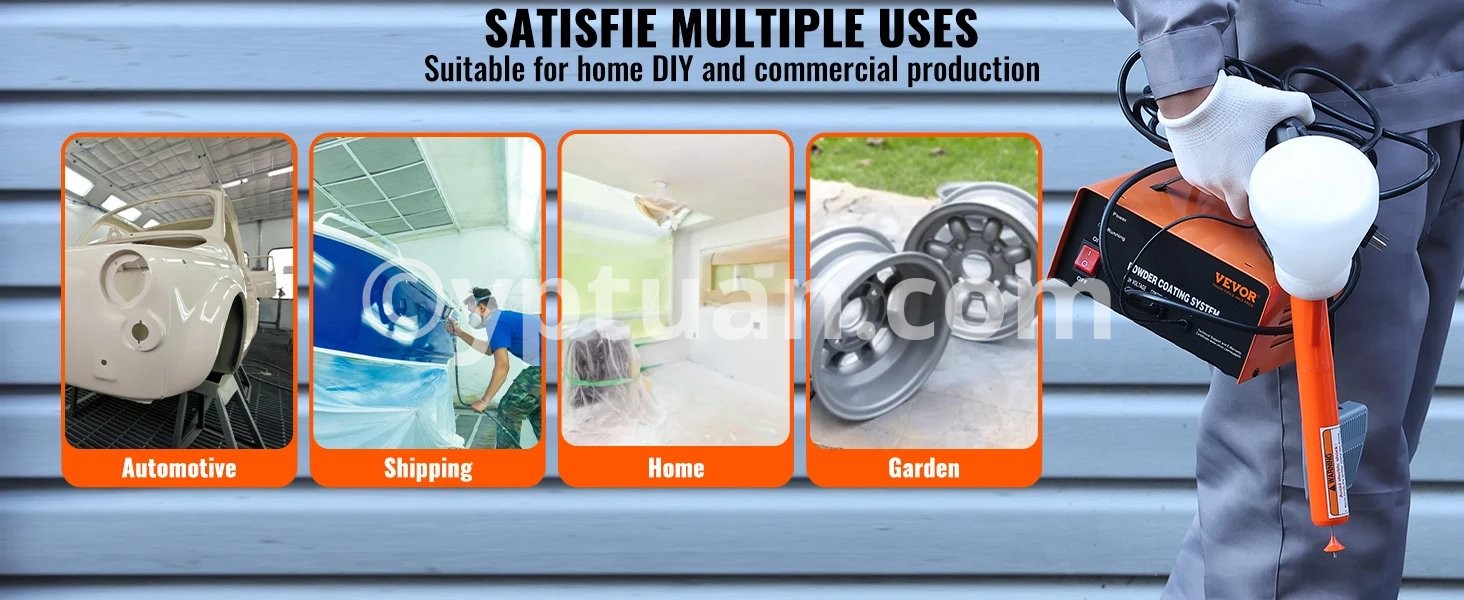 Our powder coating machine is ideal for a wide range of applications, including automotive, marine, home, and garden projects. It caters to both personal DIY and commercial production needs.
