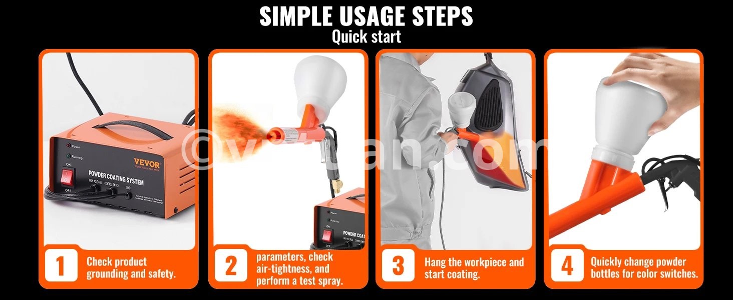 Complete your coating work in just four simple steps. Our powder coating kit is user-friendly and can be easily operated even by non-professionals.