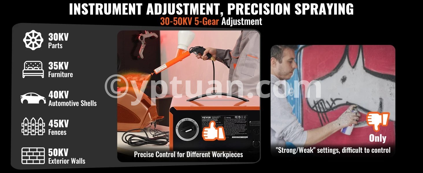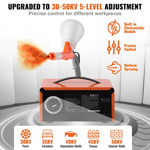 Tailor your powder coating for different workpieces by adjusting the voltage to (30/35/40/45/50)KV with 5-speed settings. Compared to conventional products with only "strong/weak" settings, our powder coating gun provides more precise and uniform control during the coating process.