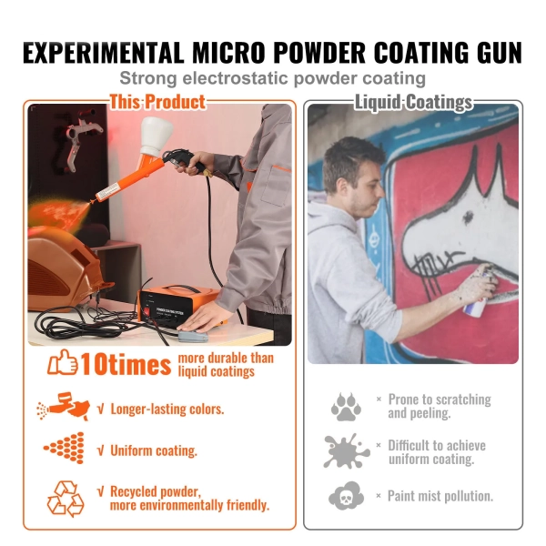 Strong Electrostatic Adhesion: This powder coating system boasts a 50KV electrostatic output, ensuring superior adhesion of the coating to surfaces. The resulting coating exhibits exceptional resistance to cracking, scratching, and wear, with colors that remain vibrant and durable. It's 10 times more durable than liquid coatings.