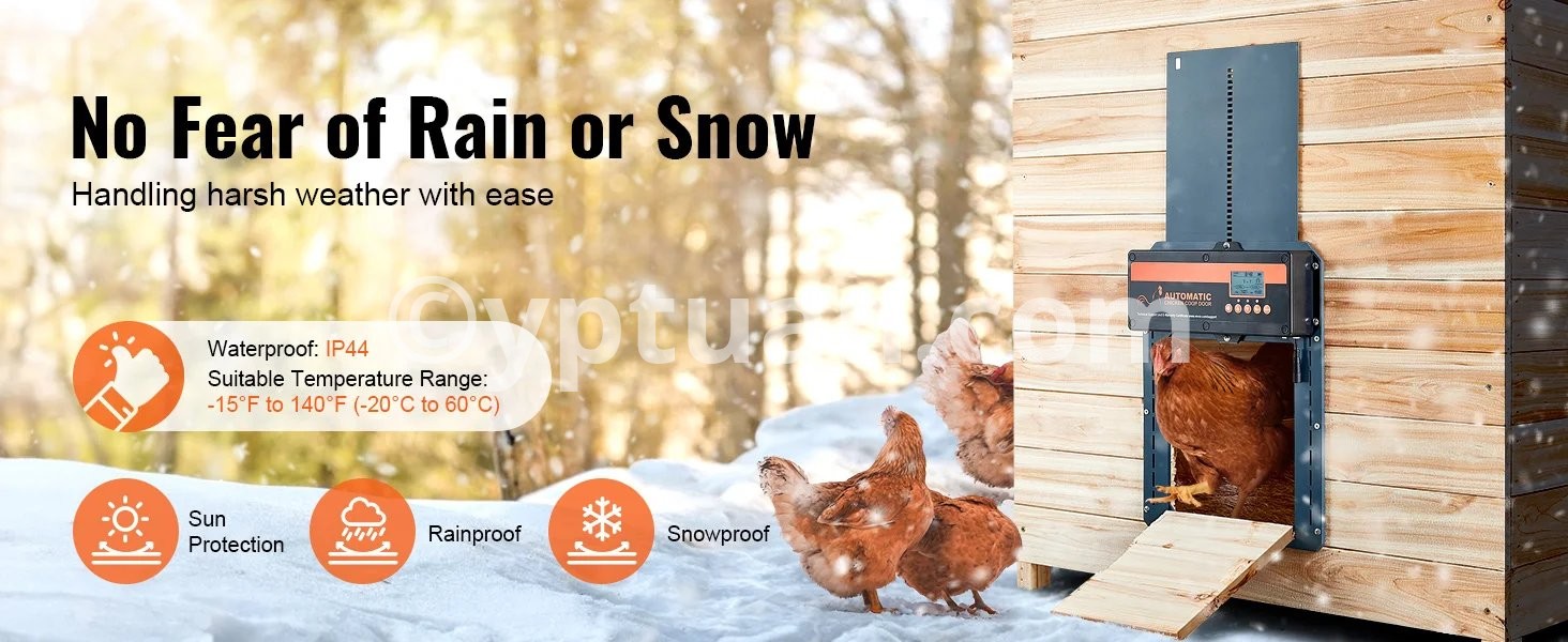 Whether it's scorching sun or heavy rain, our automatic chicken door can handle it all. It operates efficiently within a wide temperature range, from freezing winters to sweltering summers, ensuring your chickens aren't bothered by extreme weather conditions.