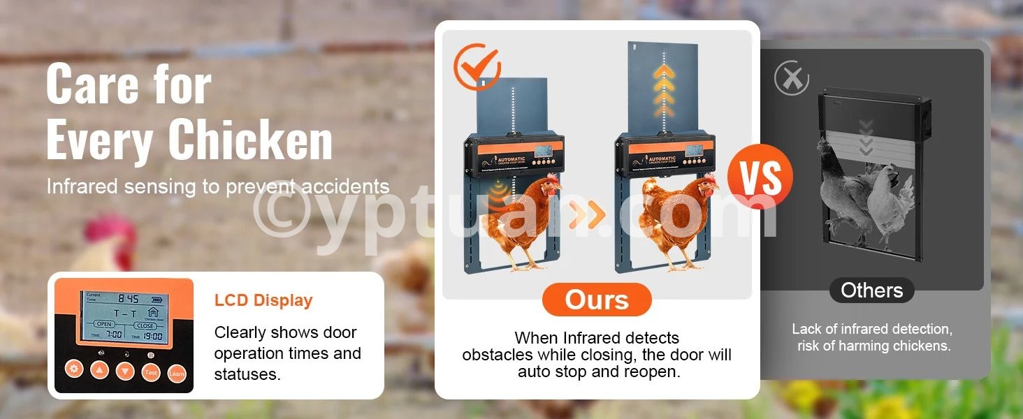 Our unique infrared technology intelligently detects any obstacles during closure. When it senses an obstruction, it immediately stops the door and reopens it, eliminating the risk of injuries. This not only ensures chickens' safety.