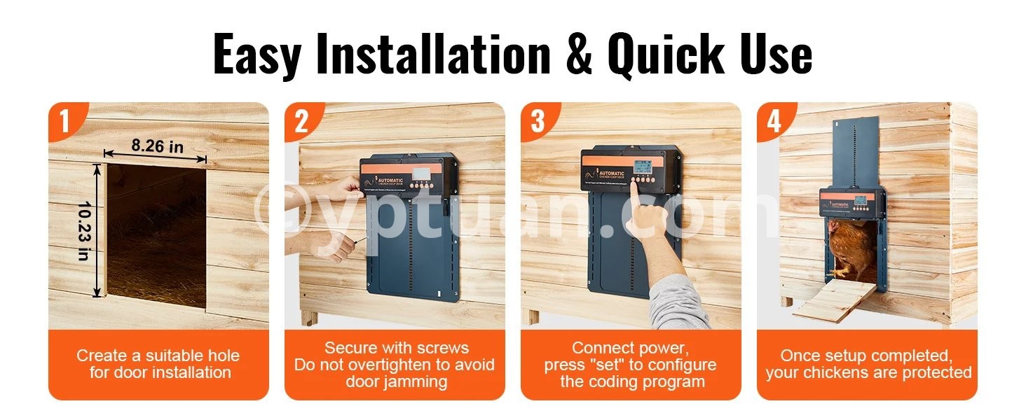 Just create a hole of the appropriate size (door size: 8.26" Wx10.23" H), securely tighten the screws (avoid over-tightening to ensure easy door movement), connect the power source, press the "set" button, and initiate the setup coding process. Once configured, your flock will be well-protected.