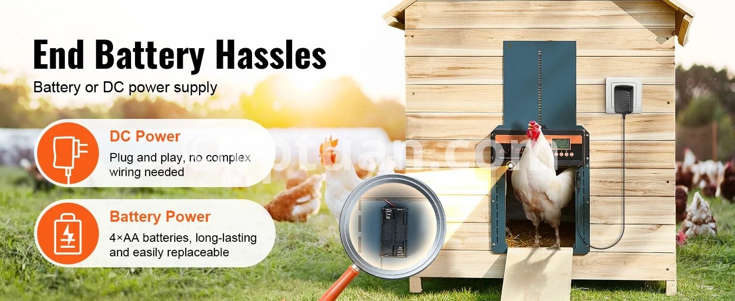 No need to worry about drained batteries. Our automatic chicken door opener supports both battery and DC power, ensuring consistent access without any stress about the power supply.