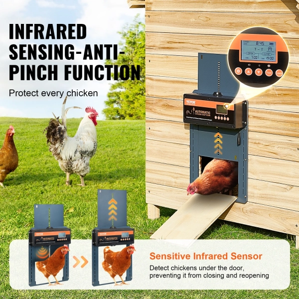 Intelligent Infrared Safety System:The advanced infrared sensors detect any obstructions as the door closes. If an obstacle is detected, the door stops and reopens, ensuring your chickens' safety and preventing injuries.