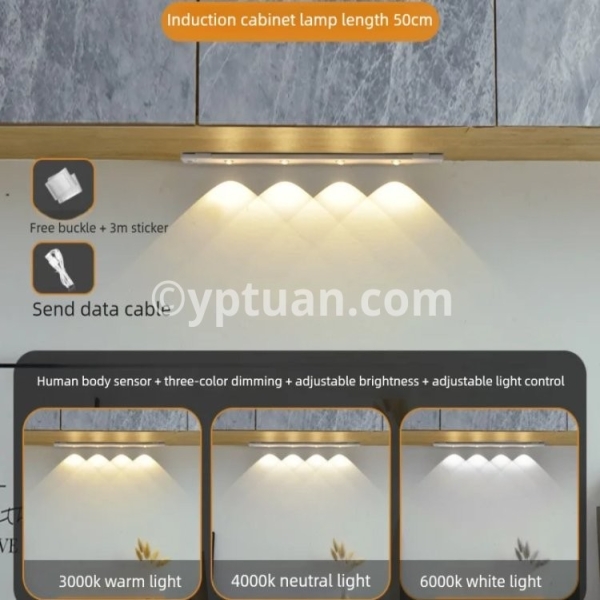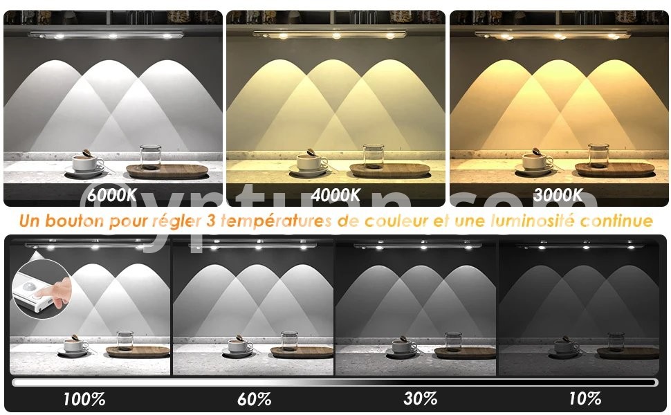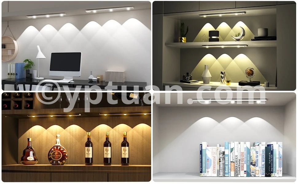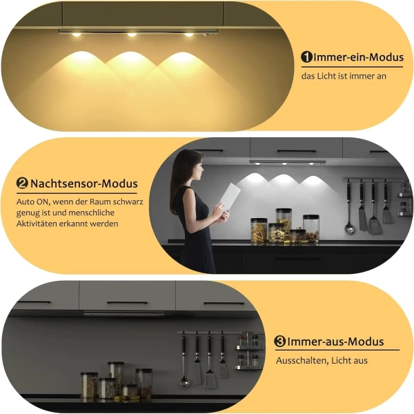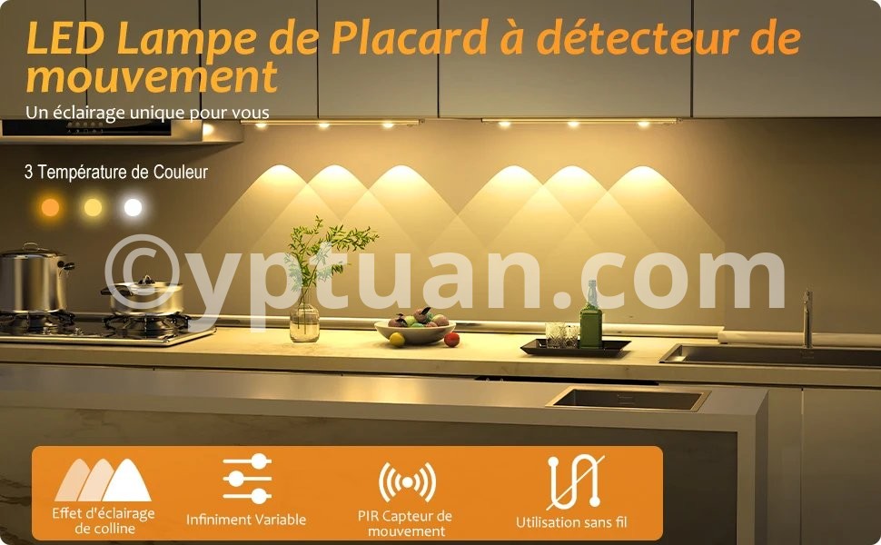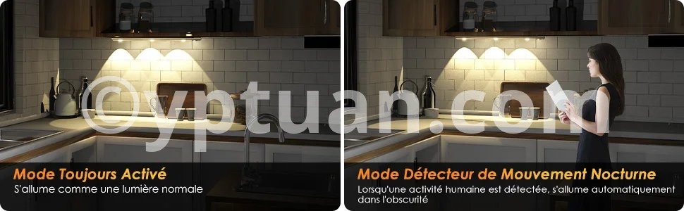 Réglage de la luminosité : appuyez longuement sur le bouton de commande pour ajuster la luminosité de la barre lumineuse. La LED change sa luminosité en douceur et en continu comme dans un cinéma. La lampe d'armoire ultra fine dispose d'une fonction mémoire intelligente, il n'est pas nécessaire de régler la luminosité. Sensibilité : lampe d'armoire à détecteur de mouvement haute sensibilité lorsque des personnes sont détectées la nuit ou dans l'obscurité. Il s'allume automatiquement dans la plage de détection horizontale de 120° et ne se déclenche pas dans un environnement lumineux. Pas besoin de toucher, pratique et rapide. Vous pouvez également changer le mode toujours allumé pour répondre à vos différents besoins. Choix de couleurs multi-lumière : il y a trois couleurs de lumière pour une lampe, il y a un blanc froid, un blanc neutre et un blanc chaud au choix. Vous pouvez changer la couleur de la lumière comme vous le souhaitez, ce qui est pratique et sans souci. Scénarios applicables : lampe LED sous meuble peut être placée dans l'armoire, la cuisine, les armoires, les armoires à vin, les entrées, les buffets, les salles de bains, les caves, les hangars, les cuisines, les chambres, les bibliothèques, les lofts, les couloirs, les têtes de lit ou des endroits sombres similaires