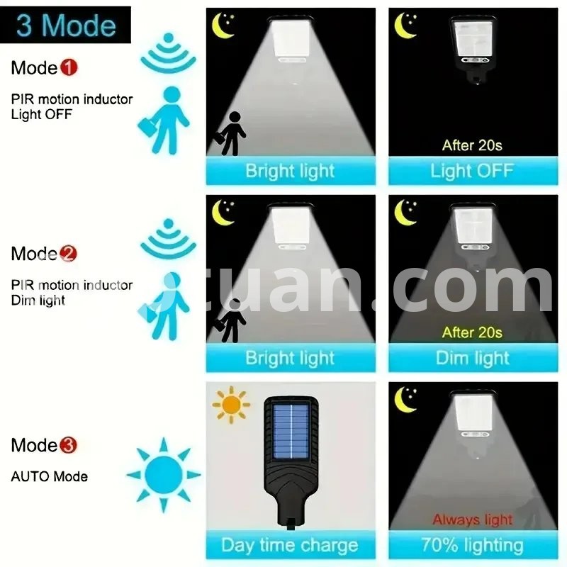 Three functions: 1. When the person walks, the light is off, the person comes to the strong light, and the person leaves after 15-20S. 2. People walk slightly bright, people come to strong light, 15-20 seconds after people walk the light is slightly bright. 3. Light up in the dark and light up at night.