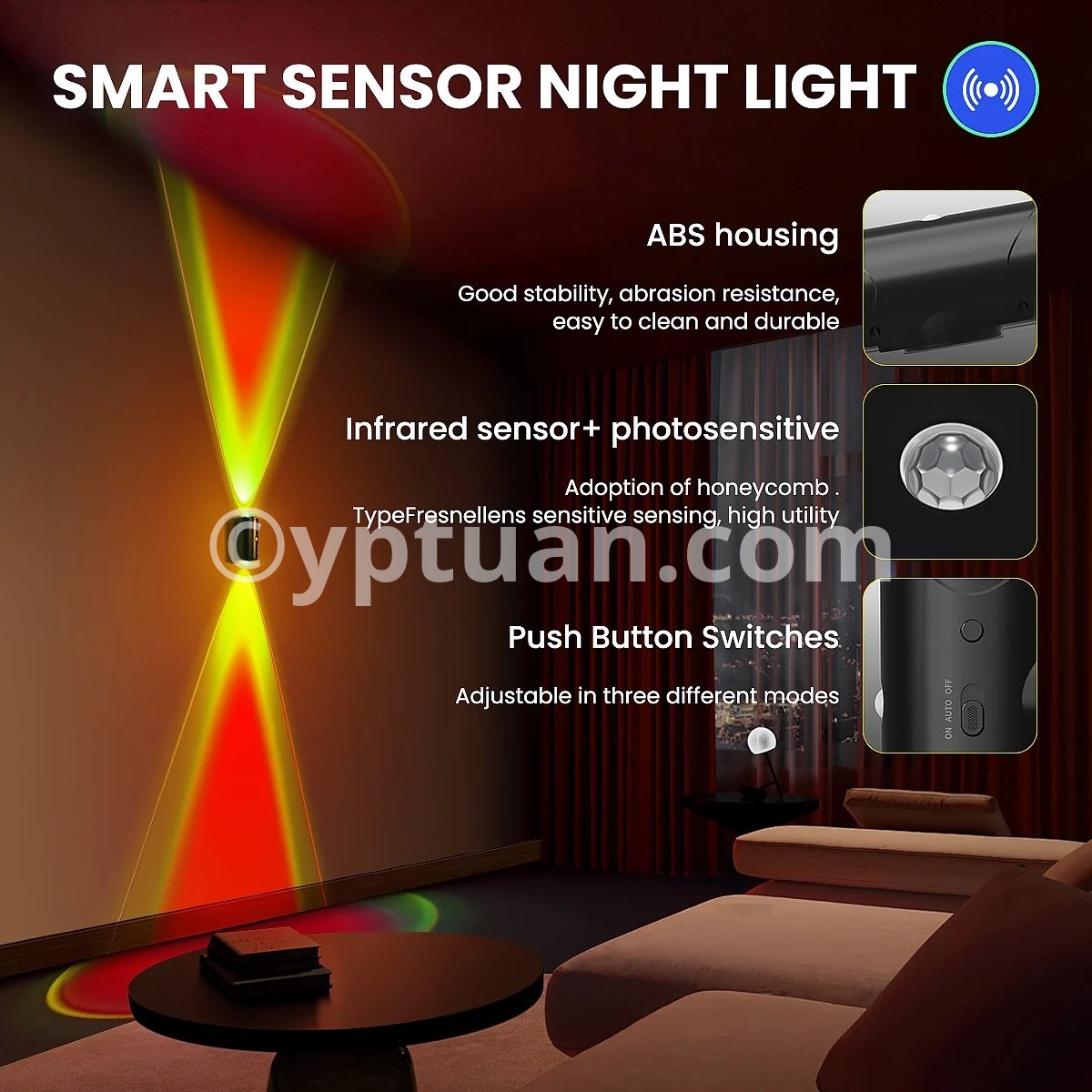 It adopts a design combining honeycomb type infrared sensing and light sensitive elements, with sensitive and highly practical sensing. When the ambient light is dim, the night light can automatically sense human activities and provide lighting.