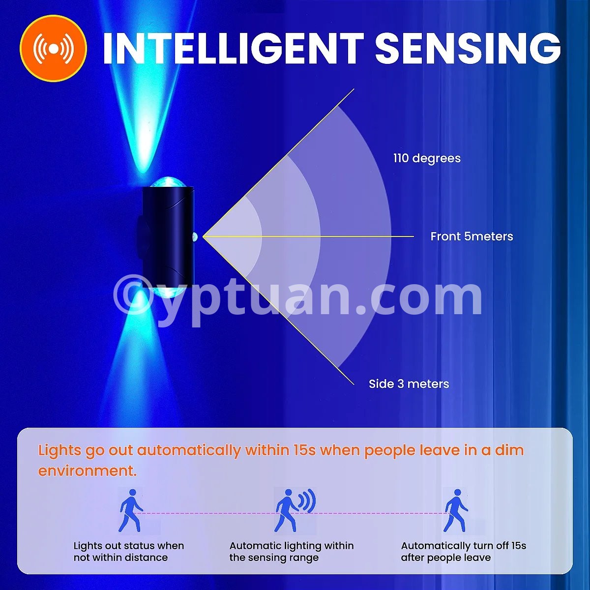 The sensing angle is up to 110 degrees, and it can accurately sense human activities within 5 meters in front and 3 meters on the side. When you enter the sensing area, the night light will automatically turn on; when you leave, the night light will automatically turn off within 15 seconds to save energy.