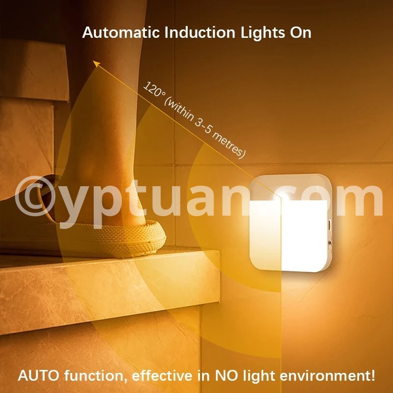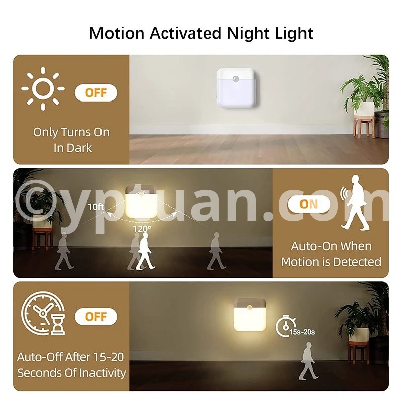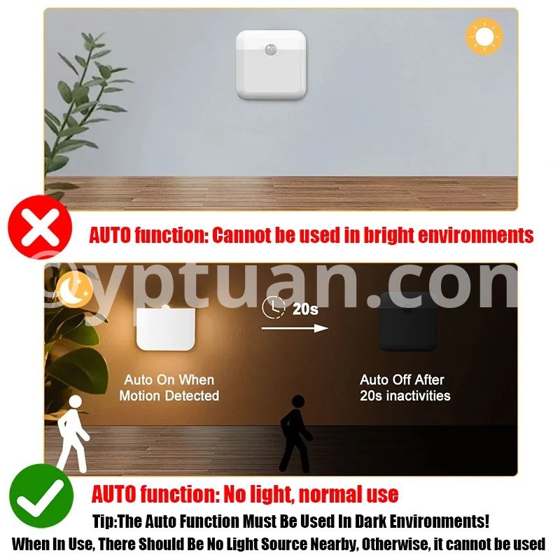 【Light Control+Human Body Sensing Night Light】 The led night light adopts human body infrared sensing and light control switch. When you walk into the sensing range at night, the light will be on immediately, and the light will be off 15 seconds after you walk. It has a sensing distance of 0-4 meters and a sensing angle of 120°.