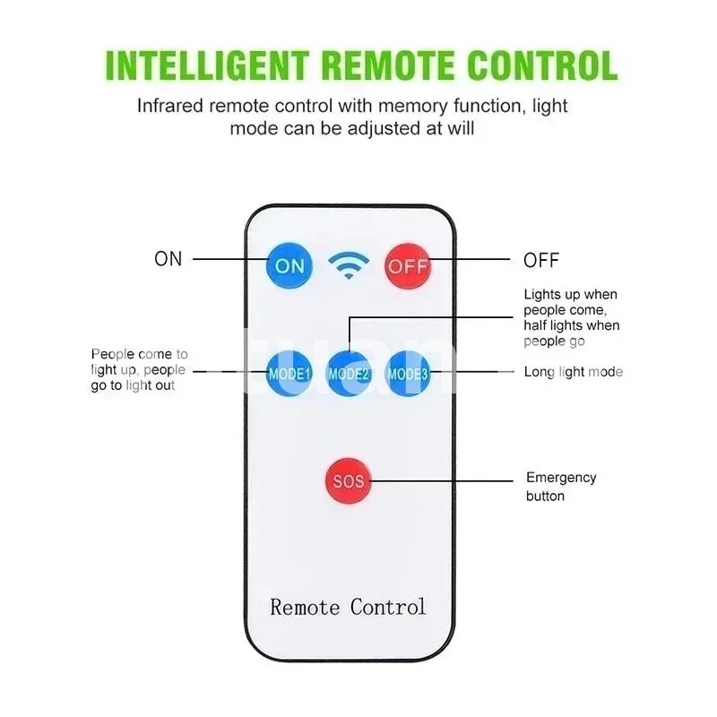 ※ 3 modes, human body sensing + remote control, sensing diameter range 5-10 meters. You can use the remote control to turn lights on and off and switch modes within a range of 8-10 meters.