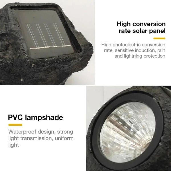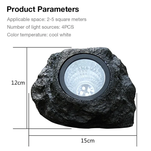 5W Solar Powered Light Simulation Stone Lights Spotlight Decoration Cold White IP65 Waterproof for Outdoor Garden Lawn Lamp Dropshipping Features: 1、Simulated Stone Shape: Resin and ABS material is made into a realistic stone shape, which has good lighting and decorative effects on lawns, roadsides and courtyards. 2、High-brightness LED: 4pcs high-brightness LED, together with high-quality PVC lampshade, gathers light and improves brightness. Low power consumption and long service life. 3、Intelligent Light Control: One-key switch, automatic charging in the sun during the day, and lights automatically at night. Charging 6-8H can light more than 8H. 4、Waterproof Performance: IP65 waterproof grade, can work normally in rainy weather. 5、Applicable Places: outdoor environments such as courtyards, parks, lawns, etc. No wiring is required, it can be used after being placed. Specifications: Name: Solar Powered Light Material: resin + ABS Solar panel: 2V 40ma amorphous silicon Light source: 4pcs LED Color temperature: cool white Rated power: 5W Battery type: 600mAh NiMH battery Charging time: 6-8H Lighting time: 8H Control mode: switch + light control Waterproof rating: IP65 Product weight: about 470g Size: about 12 * 15 * 10cm/4.72*5.91*3.94in Packing List: Solar Powered Light * 1