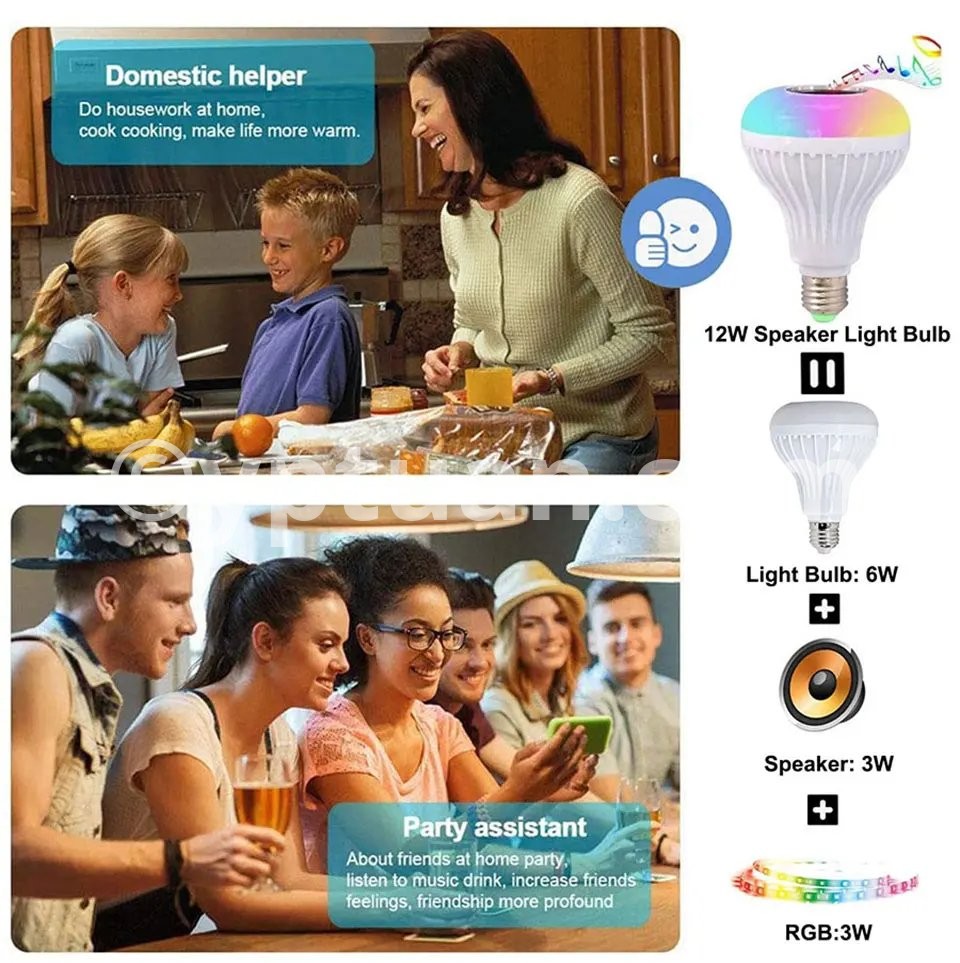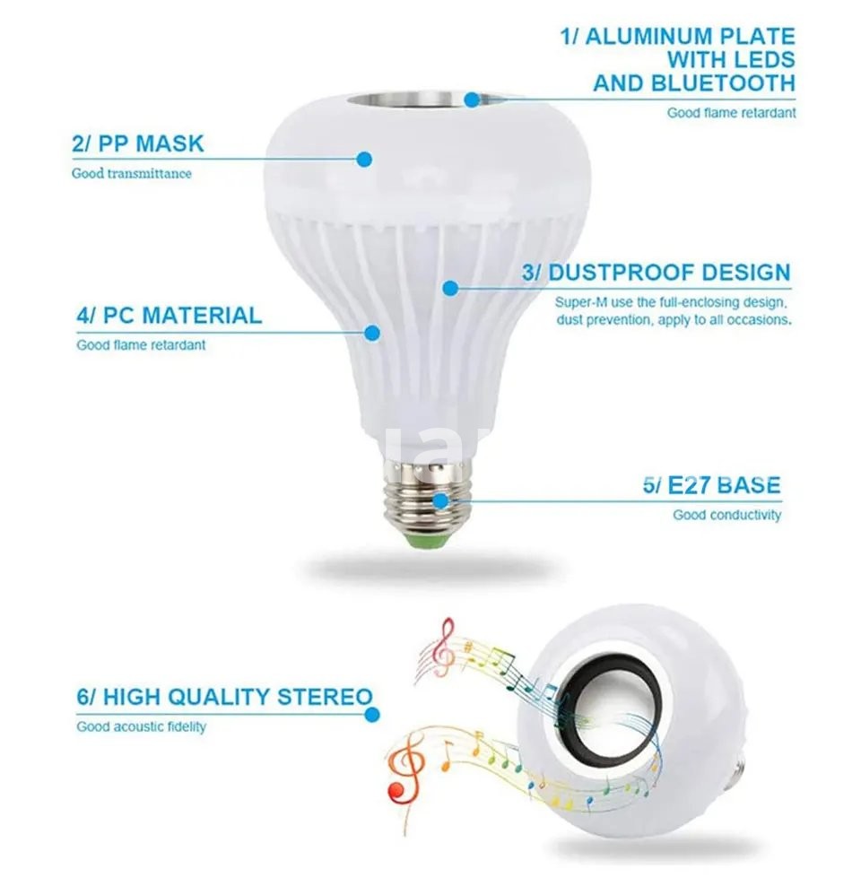 1. This bulb is a Bluetooth enabled, multicolored, energy efficient smart LED light. 2. Adjustable volume of light and music, comparable to a 50 Watts halogen bulb. 3. Energy saving and good quality Support music, with Bluetooth 4.0. 4. One remote controller can control multi bulbs(the light).But one bulb can only be connected to one bluetooth device(output sound). 5. Suitable for the bedroom, closet, cabinet, corridor, workshop, basement, garage, stairwell, oil depots, roof, door and other places.