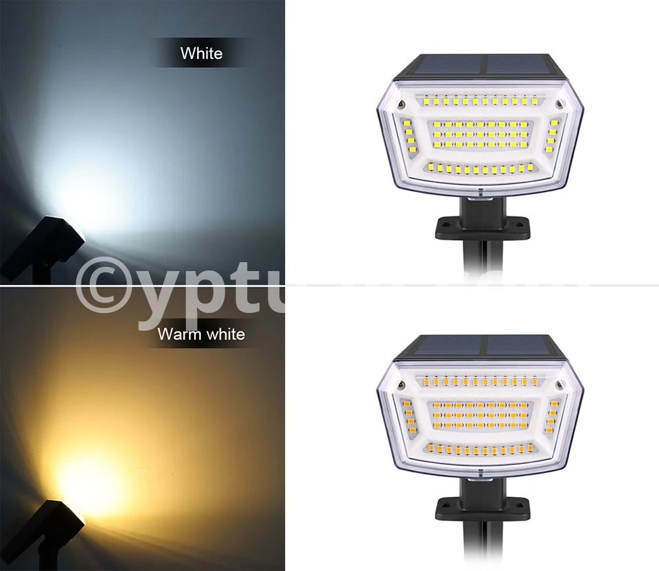 【3 Brightness Lighting Modes】: 59 LEDs solar landscape spotlights, 3 Considerate brightness modes: you have the option to set from High Mode (MAX 6Hrs) to Medium Mode (MAX 10Hrs) or Low Mode (MAX 20Hrs) to extend working time.When the brightness is low enough to require illumination, it automatically switches from energy storage mode to a lighting mode that does not require motion detection (auto on at night/auto off at sunrise).