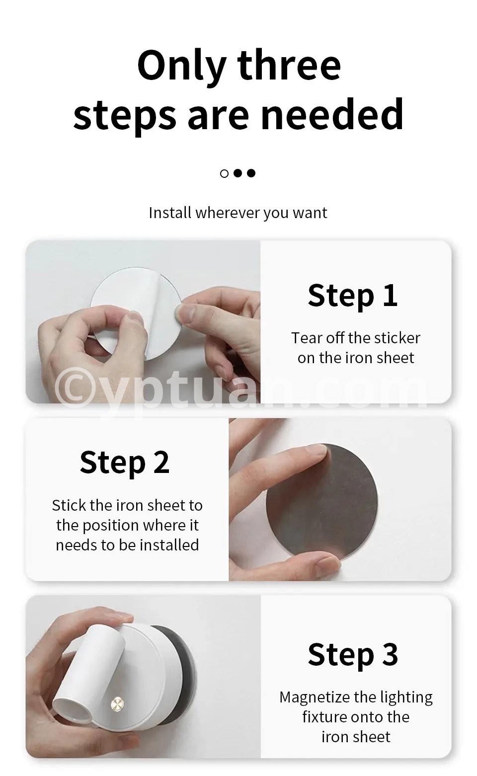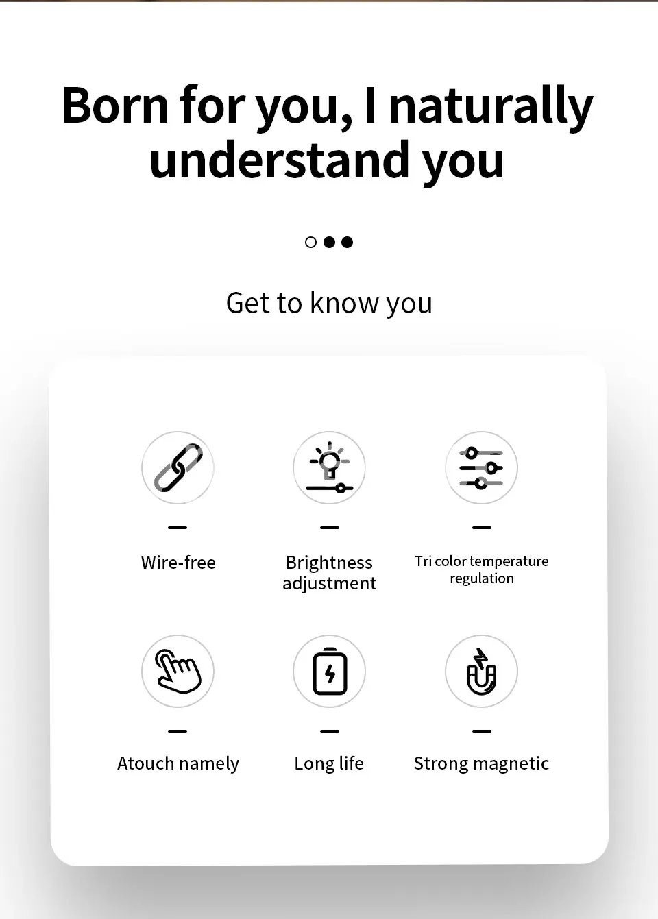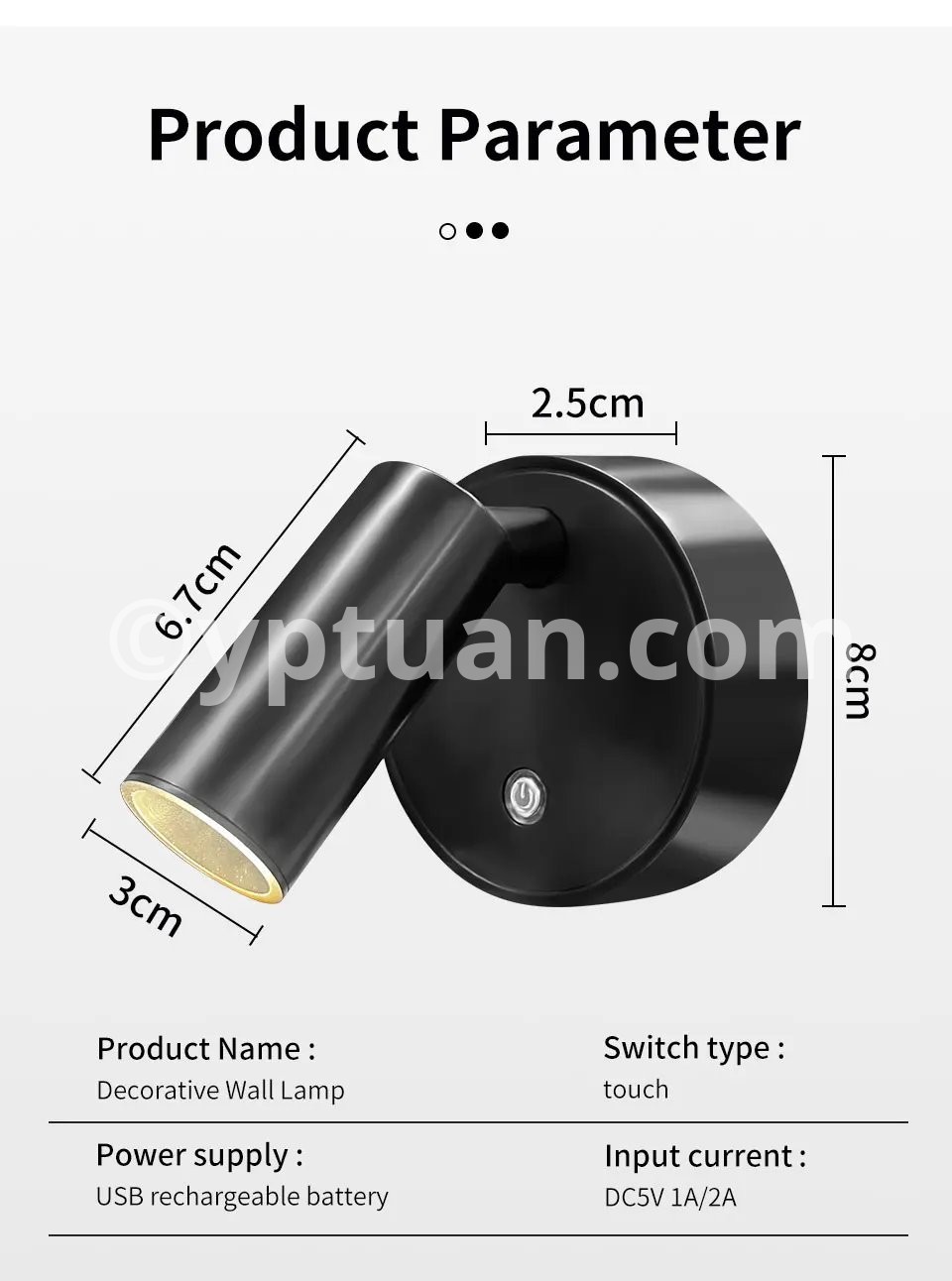 Product name:Touch three-color rechargeable wall lamp Model:Mini Battery: 1200 mAh Size: 8*6.8*3cm Adjustment: 90 ° up and down swing / 360 ° left and right rotation Charging: USB charging Package Include:Lamp*1 Data Cable*1 Magnetic Patch*1