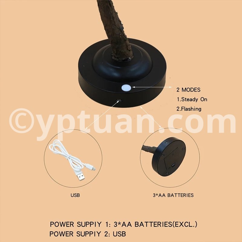 [DIY high-quality lamp tree]The LED bulbs, which are safe and energy-saving, will not be heated after a long time use. LED tree inside uses exquisite and natural tree-like wrapping material, branches are flexible and flexible enough to meet your DIY needs. You can bend the branches into any shape you like, or shape them to fit in the room. [2 power supply modes]powered by 3 AA batteries (batteries/charger not included, USB included) and USB cable, flexible choices. IMPORTANT: Please remove the USB cable when using batteries, otherwise it will not light up! You can choose the power mode according to the requirements of the scenario. [Easy to assemble and use]this light tree also has an improved touch on/off function in the base, sensitive response touch switch makes it very easy to use. 4.5 V extremely low battery and 5 V USB voltage, very safe to use. [Decorative lighting] premium LED bulbs, soft light makes the eyes comfortable. Warm white light bright.