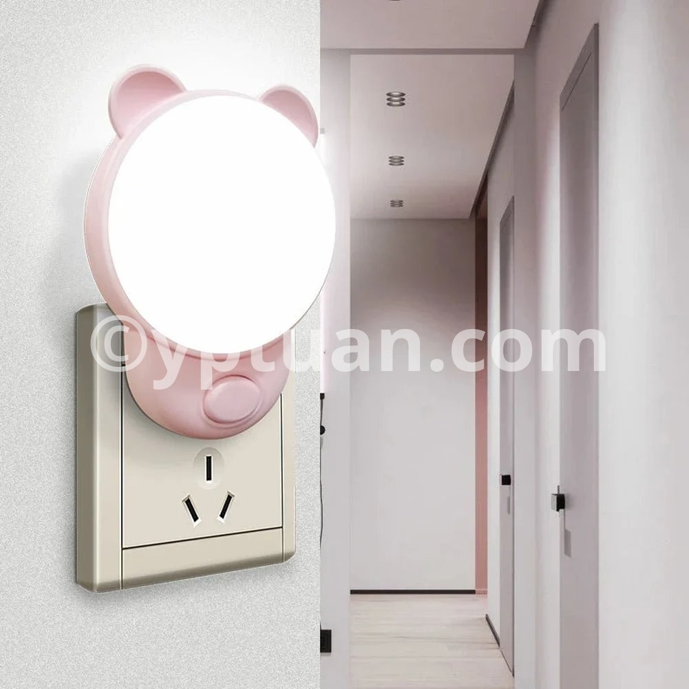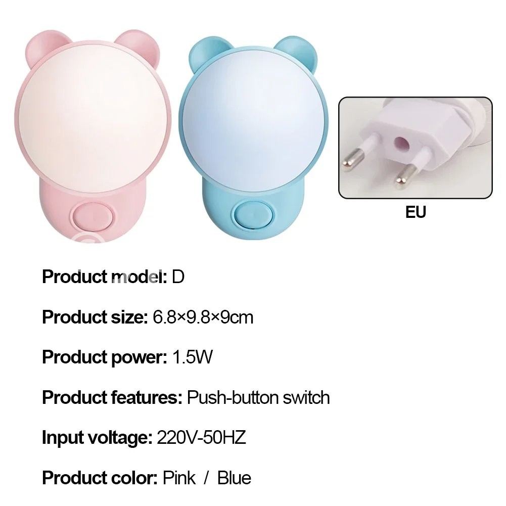 Material: ABS+LED Color: Pink/Blue Light Color: Warm, White Size: 6.8*9.8*9cm Power Way: Plug in, EU plug, UK plug,US plug Sensor Type: Light Sensor Power:1.5W Package included: 1pc x Light Sensor Motion Lamp