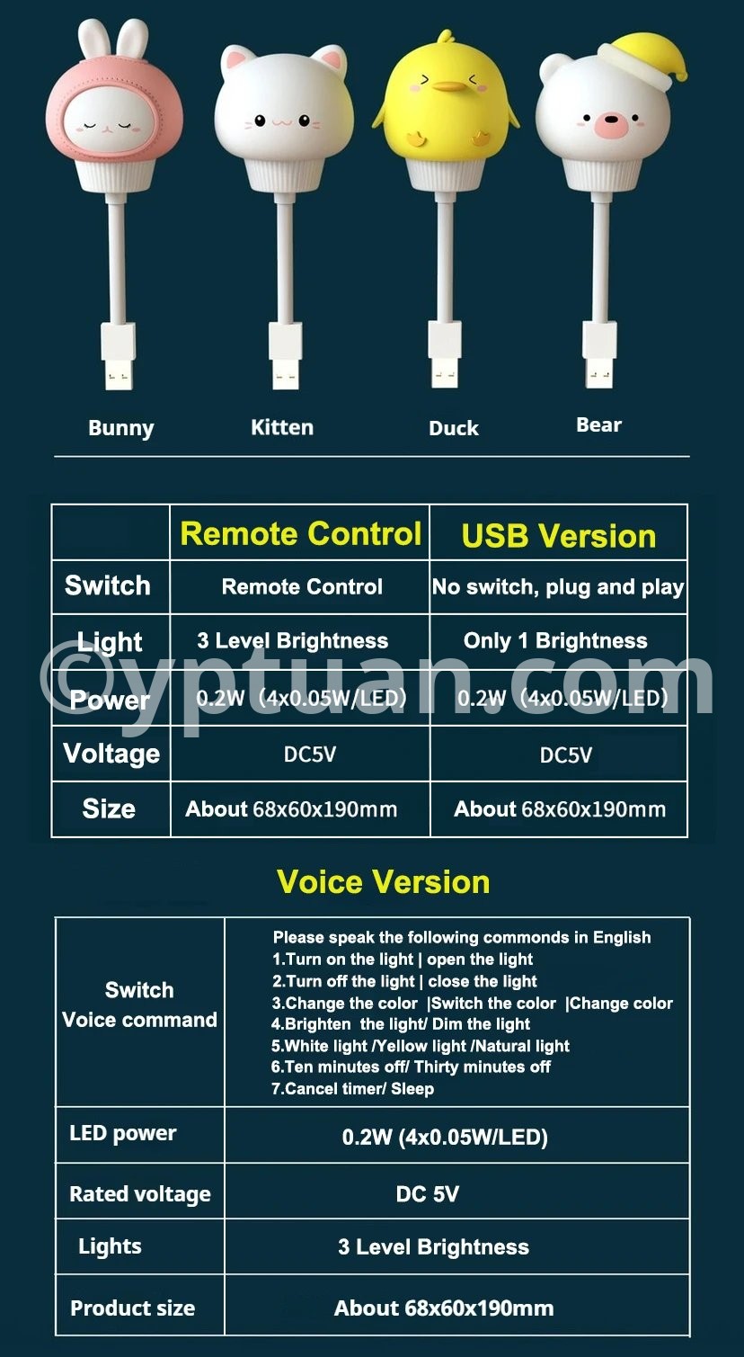 USB Night Light LED Voice Control Cute Cartoon Night Lamp Bear Kitten Remote Control for Baby Kid Bedroom Decor Bedside Lamp