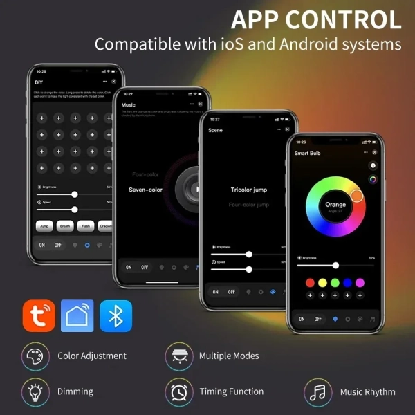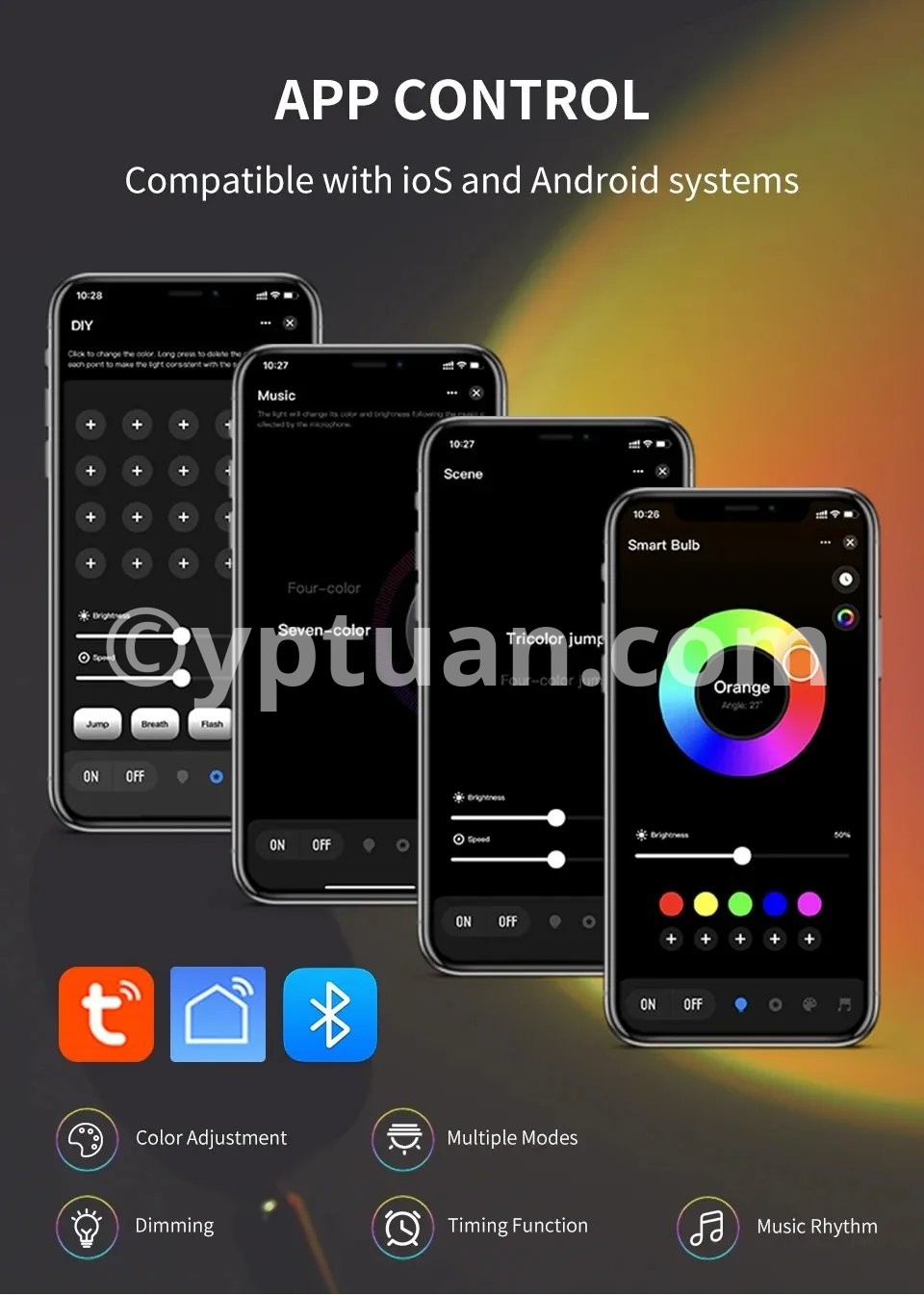 1. With smart app (Tuya or Smart Life), controlled by the bluetooth function of your phone, you need to download the app. With music rhythm and countdown function. You can adjust the color or dime the brightness on your phone. There is also an IR remote which can also control the light.