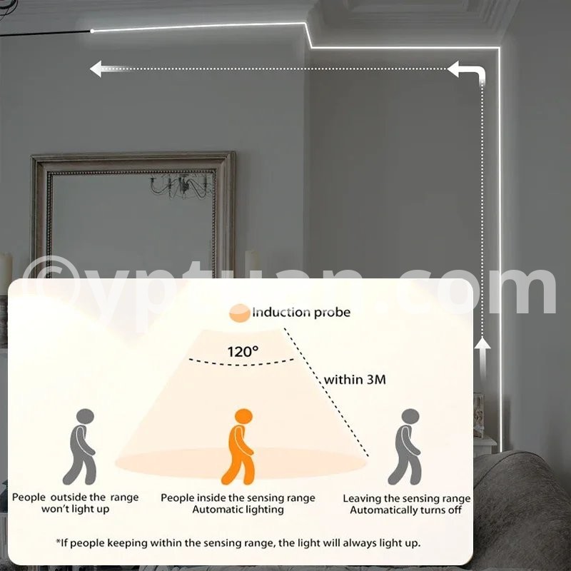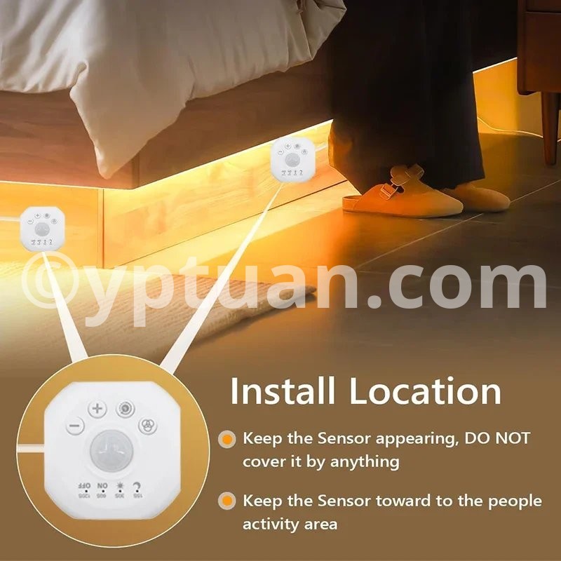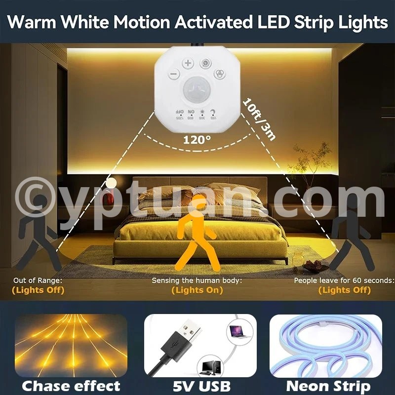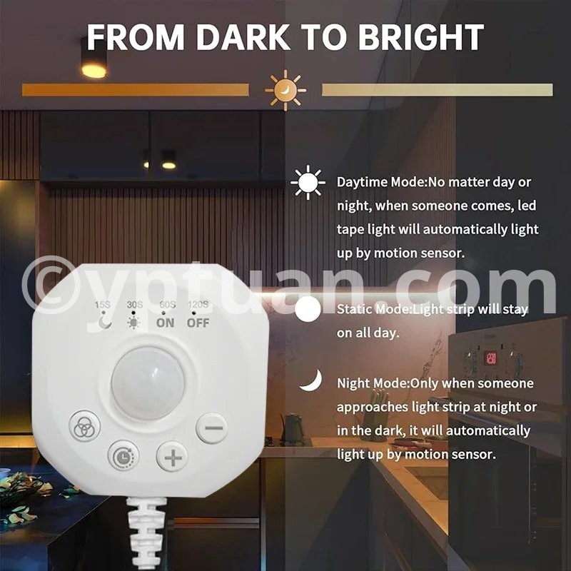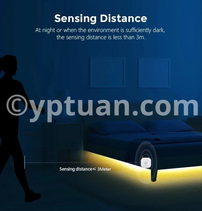 Specification: Effect:Chase Effect Working voltage: DC 5V Powered by: USB Length: 1m, 2m, 3m, 4m, 5m Detection Range: 3-4 meters Detection distance: 1M-3M Delay time: 15sec-2min (adjustable) Sensing Angle: 120 degrees Light Control: 2 modes. Mode 1: Day and Night Mode 2: Night