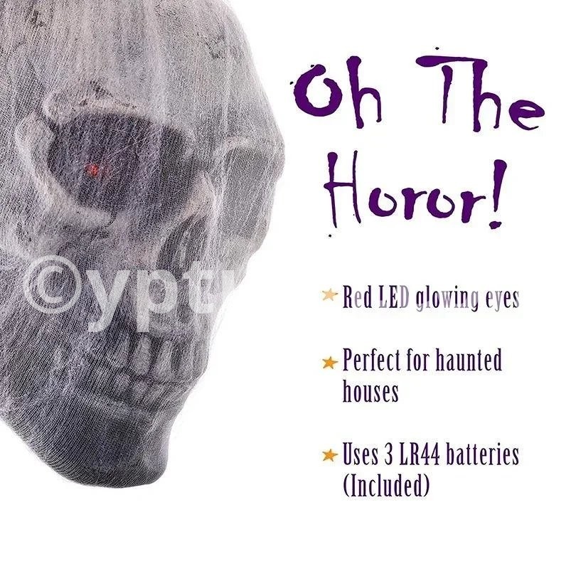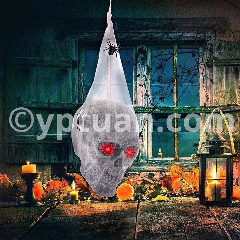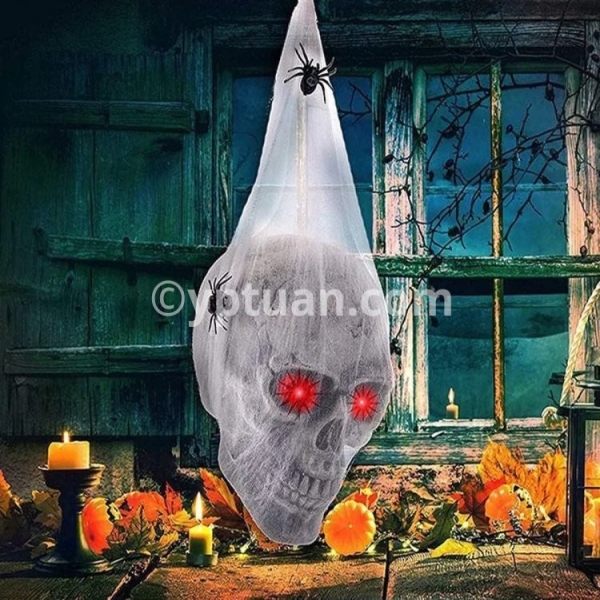 Product Description: Halloween Hanging Skull with Light Up Eyes Features: 1. There is an on/off switch at the buttom, when turn on it, the skull's eyes will light up, it's very scary when you open a door and see such a skull with light up eyes... 2. The skull is as big as a human head, just realistic. It's surrounded by cobwebs, and there are some spiders on the web, when haning it, it's really spooky for Halloween 3. You may see the products that "skull on the ground", or just "a small skeleton", that's out of date. Ours' hanging skull is new design, new decor for the Halloween 4. You can hanging it anywhere you want, home, yard, tree, haunted house and so on. Or just put it on the ground, it's also scary, widely usages for Halloween decor Specifications: Size: 6.3"x19.7" (16x50cm) Material: Plastic