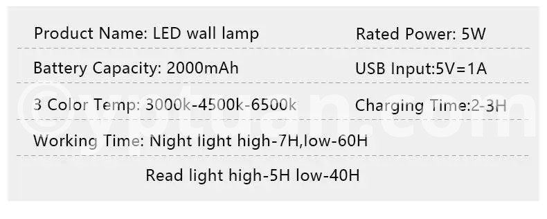 -Rated Power: 5W -Product Size: 80mm * 60mm -USB Input: 5V 1A -Temperature Color:3000K+4500K+6500K+RGB -Battery Capacity: 2000mAh -Charging Time: 2-3H -Working Time: ≥7H -Working Time: Night light high-7H,low-60H Read light high-5H,low-40H