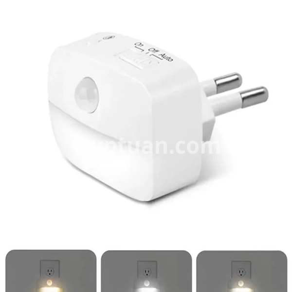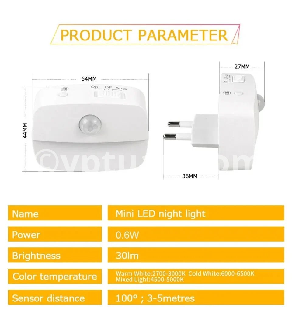 Voltage:AC90-240V Power: 0.6W Material: ABS + PC Light Source: LED Sensor Mode: Light Sensor & PIR Motion Sensor Sensor Range: 3-5m Sensor Angle: 100 Degree Delay Time:20-30s Plug Type: EU/US Plug Light Color: warm white(2700-3000K), cold white(6000-6500K),mixed light:4500-5000K brightness lumens: 10-30LM control botton function: long press (brightness adjust 15%-100%), short press(emitting color adjust warm white - cold white - mixed light)