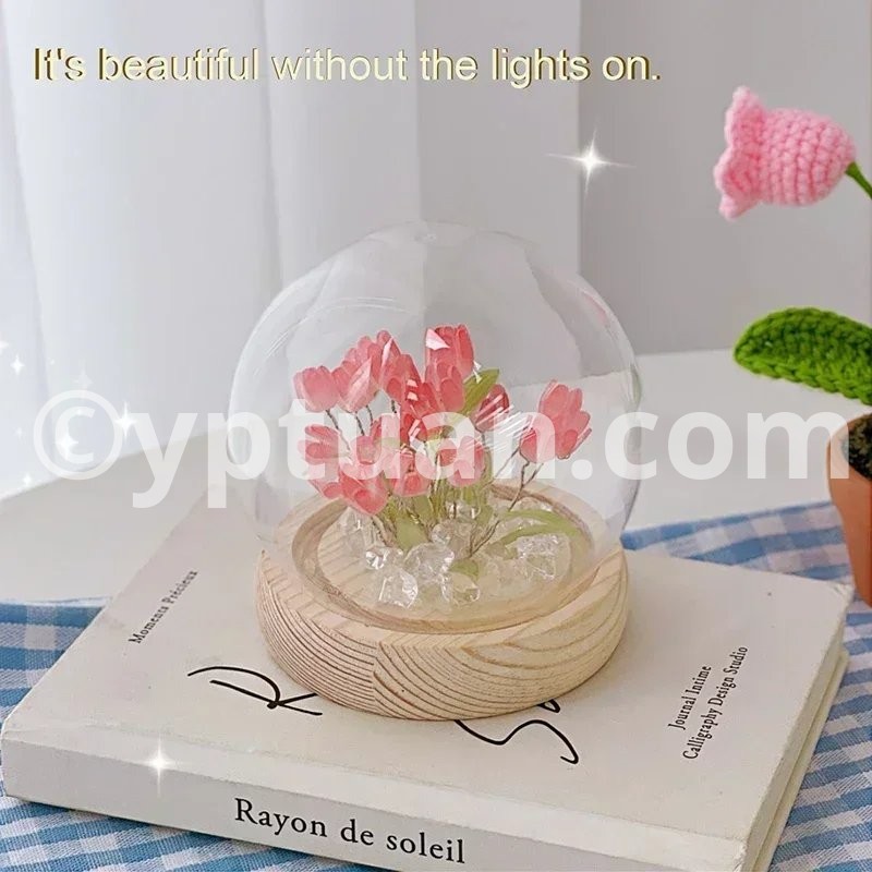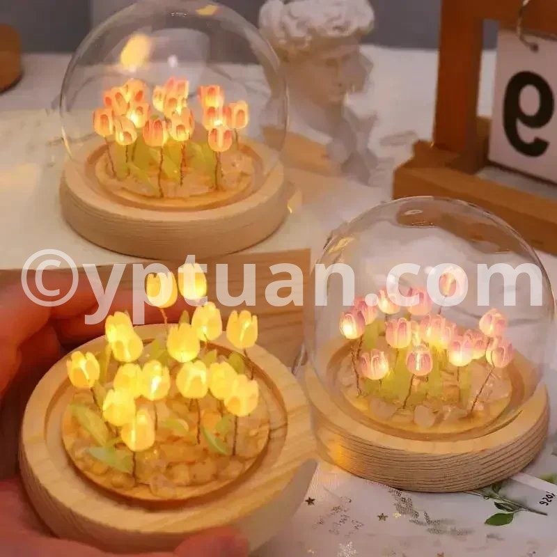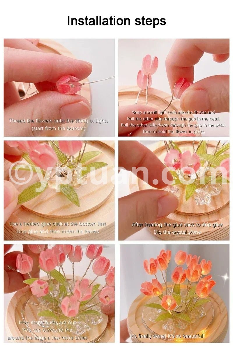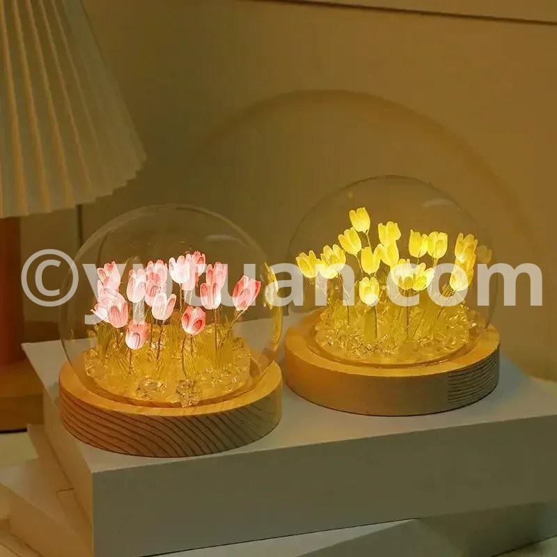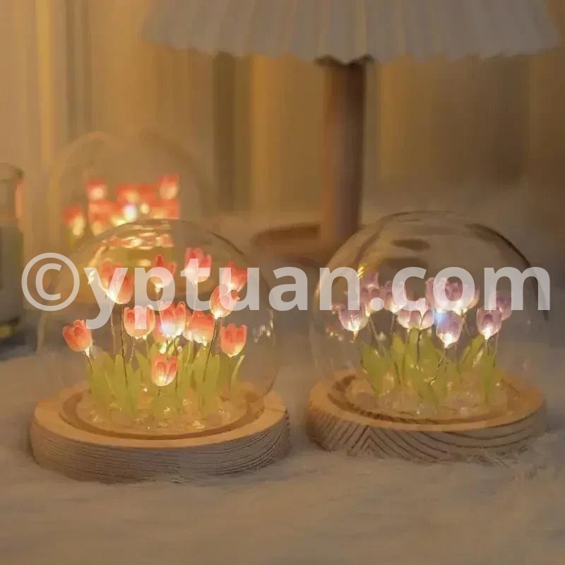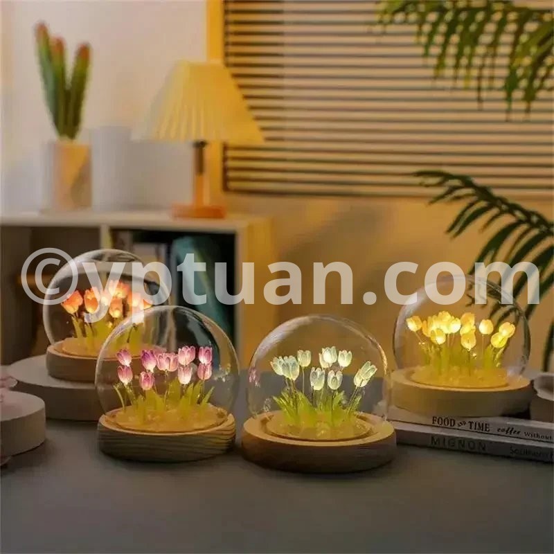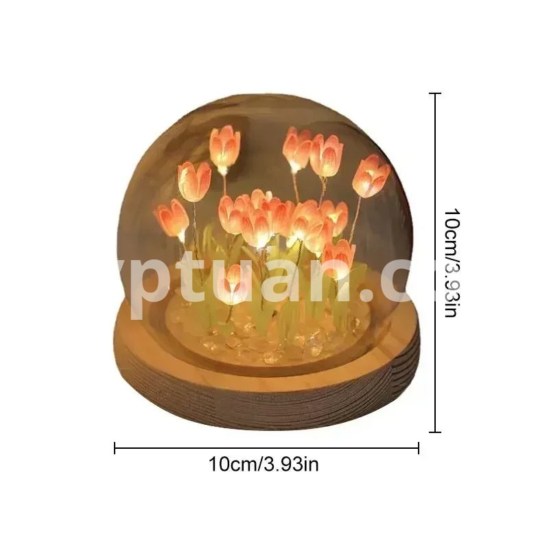 Attention: Only 9 tulip flowers!!! Details: Product Name: Tulip Night Light Material: Wooden + LED Light + Glass Product Size: 10cm×10cm Features: [Cute Tulip Lamp] The language of tulip is eternal love, and this light looks so cute and beautiful. You can show it on the coffee table, bedroom, kitchen counter, dining table, living room and more. [DIY Handmade Light] This light needs to DIY by yourself, so you can experience handmade fun. You can adjust each flower to the position you want. It looks elegant and like real flowers. [Battery Operated] There is no wire connected to an outlet.It requires 3 AAA batteries (not included).The battery is easy to replace and it works for a long time. [Ideal Gift] With beautiful decorative wooden base and dome glass shade, this light is a good decoration for your room. It is also an ideal gift for your friends on birthday or wedding decoration.