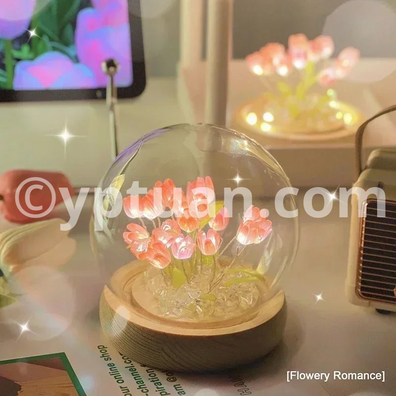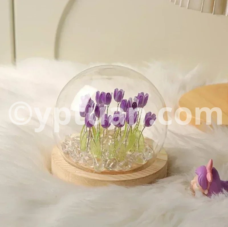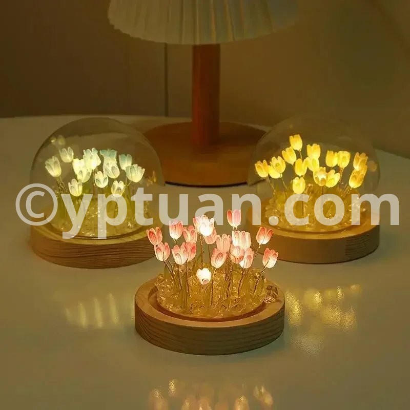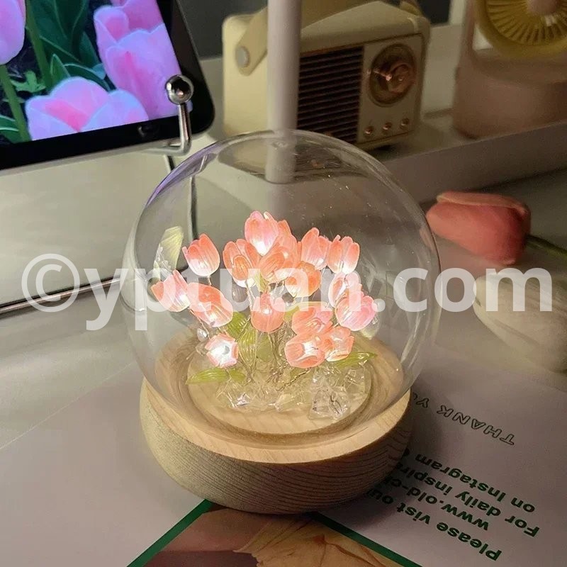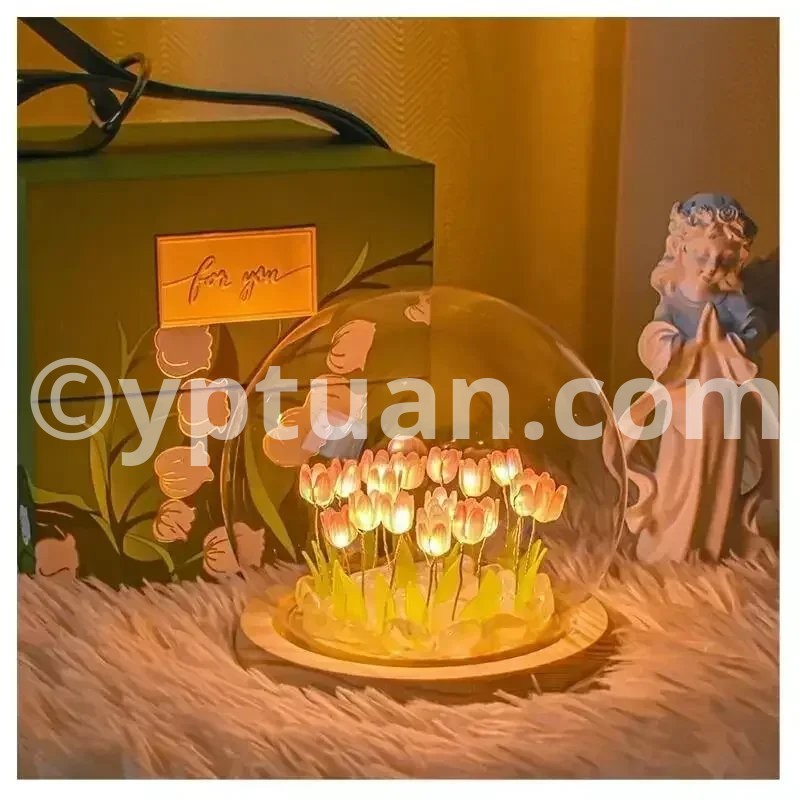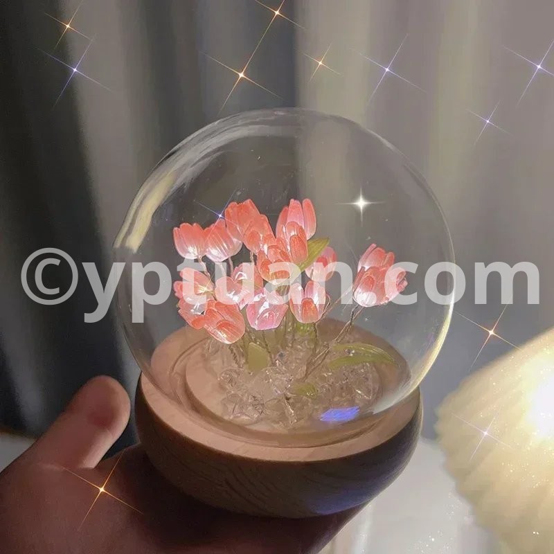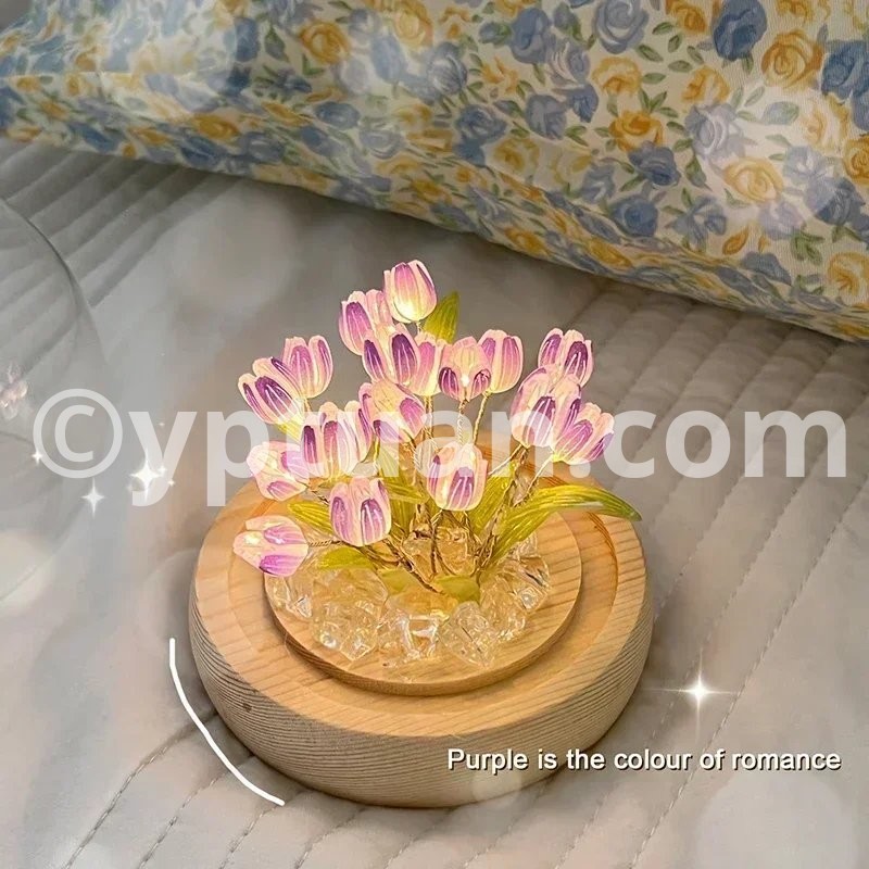 Attention: Only 9 tulip flowers!!! Details: Product Name: Tulip Night Light Material: Wooden + LED Light + Glass Product Size: 10cm×10cm Features: [Cute Tulip Lamp] The language of tulip is eternal love, and this light looks so cute and beautiful. You can show it on the coffee table, bedroom, kitchen counter, dining table, living room and more. [DIY Handmade Light] This light needs to DIY by yourself, so you can experience handmade fun. You can adjust each flower to the position you want. It looks elegant and like real flowers. [Battery Operated] There is no wire connected to an outlet.It requires 3 AAA batteries (not included).The battery is easy to replace and it works for a long time. [Ideal Gift] With beautiful decorative wooden base and dome glass shade, this light is a good decoration for your room. It is also an ideal gift for your friends on birthday or wedding decoration.