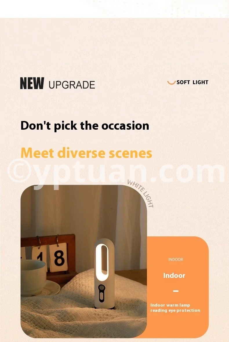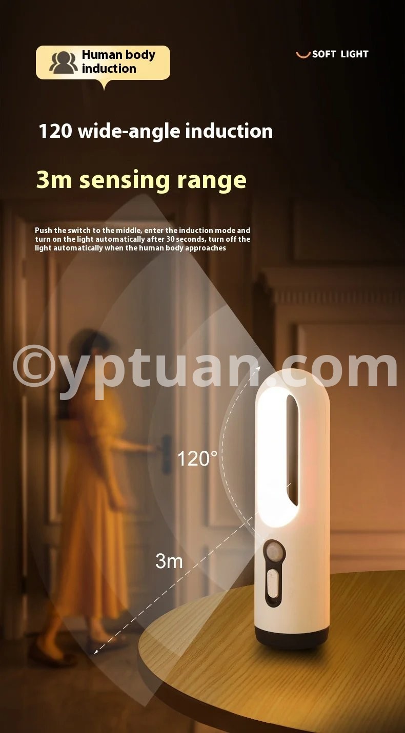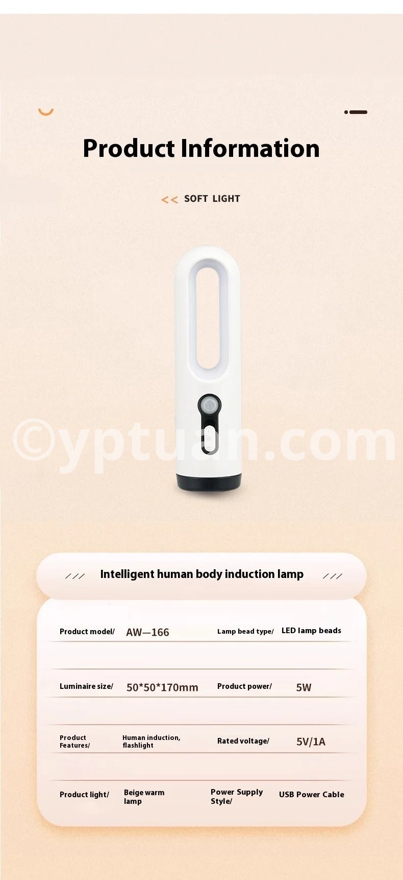 Battery:14500 3.7V 600mAH lithium battery Lamp beads:16LED(main light)+XPE 2W(spotlight) Flick switch function: spotlight ON-OFF Toggle Switch Function:LED ON-SENSE-OFF Induction light duration:20±5S Charging function: Charging red light, full green light Charging time:2±0.5H For the purposes of this Regulation, the following definitions shall apply: Sensing distance:7M±2M Lightning: 80LM Spotlight ≥100LM Power:LED lW XPE 1.2W Charging power:≥2w Products Contained Multi-function night light * 1 Instruction manual*1 USB cable*1