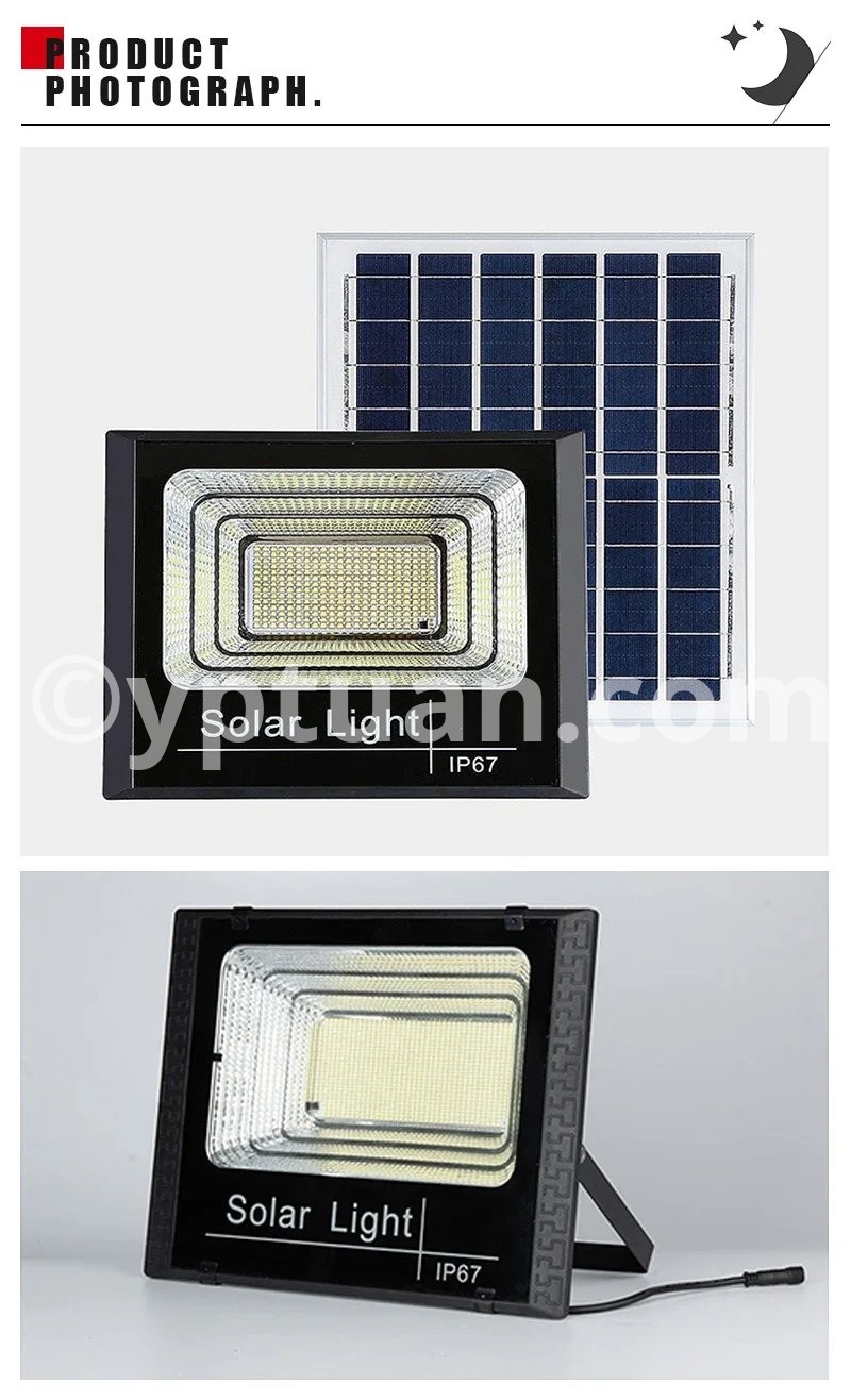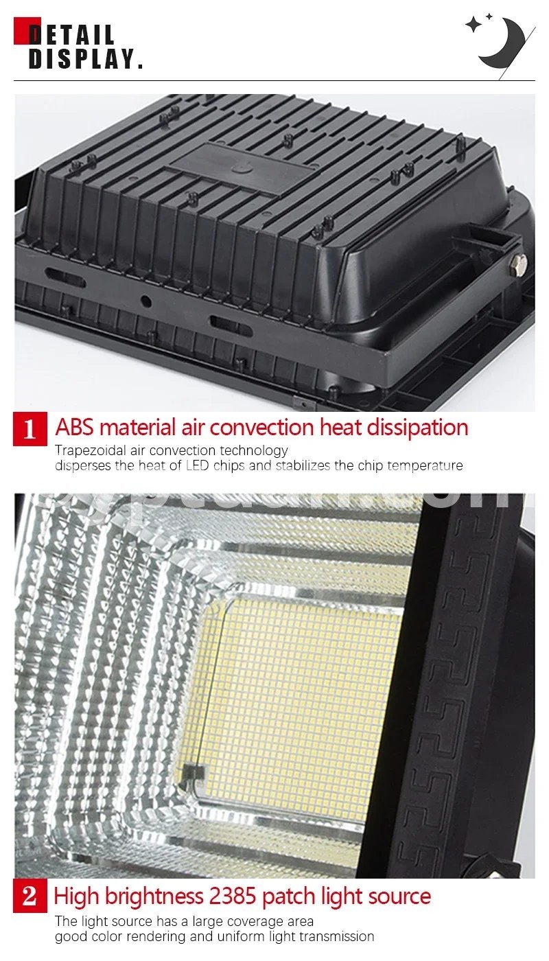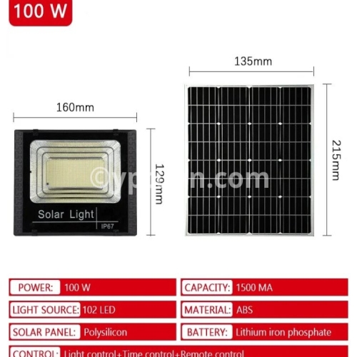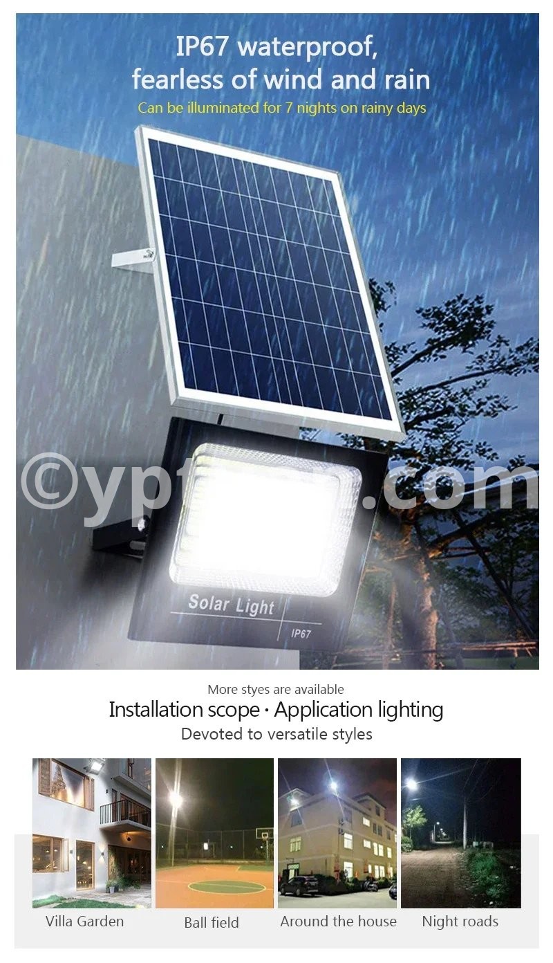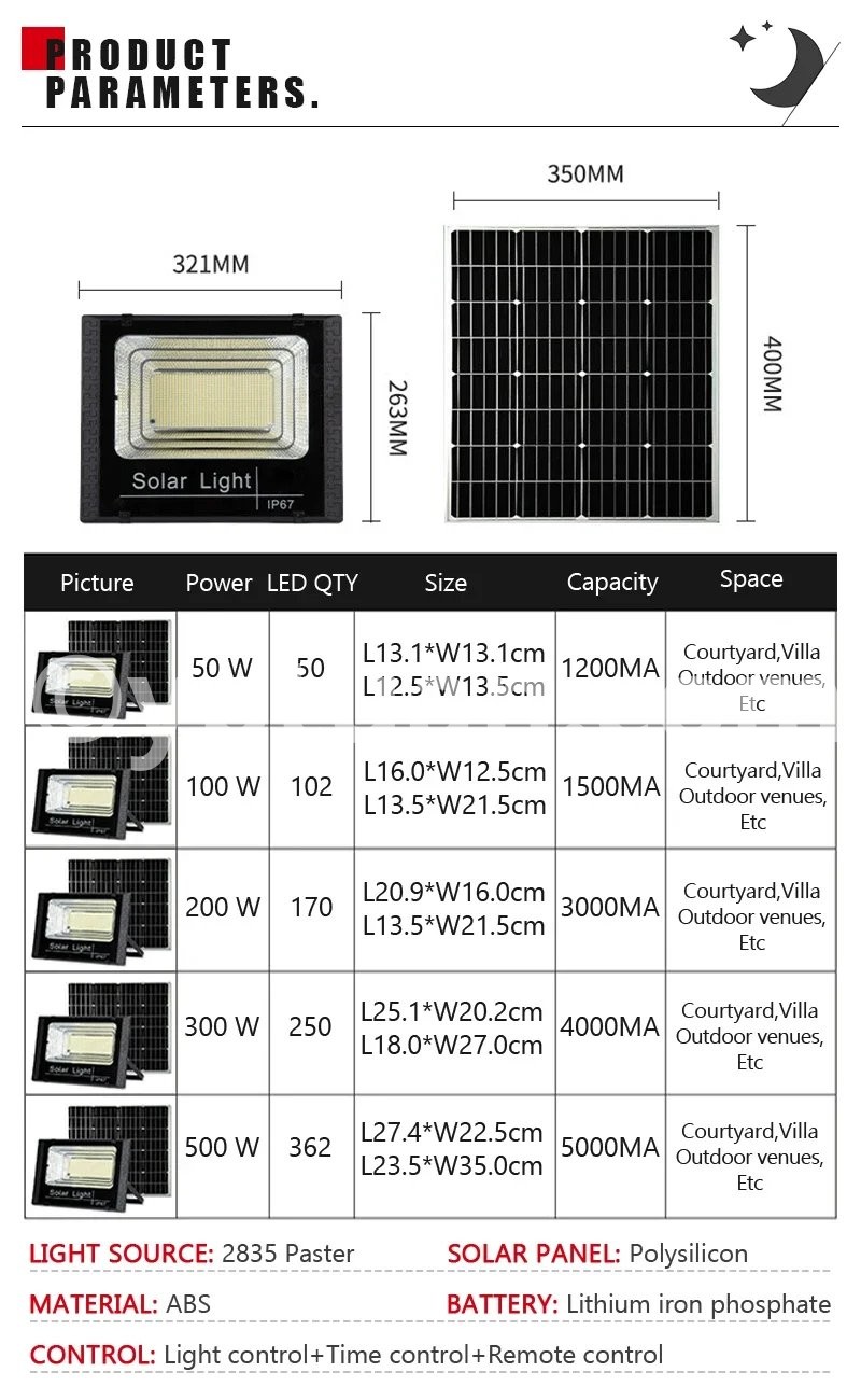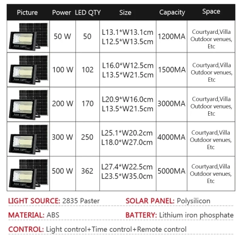 Lamp body material: ABS plastic Working mode: lighting control+time control+remote control Power/Size: 50W/L13.1cm * W13.1cm 100W/L16cm*W12.5cm 200W/L20.9cm*W16cm 300W/L25.1cm*W20.2cm 500W/L27.4cm*W22.5cm Number of LEDbeads: 50/102/170/250/362 LEDs Battery type: Lithium iron phosphate battery Solar panel category: Polycrystalline silicon Light source type: 2835 SMT