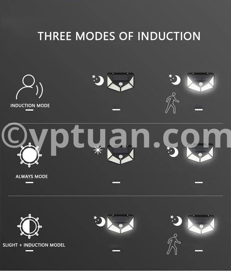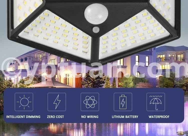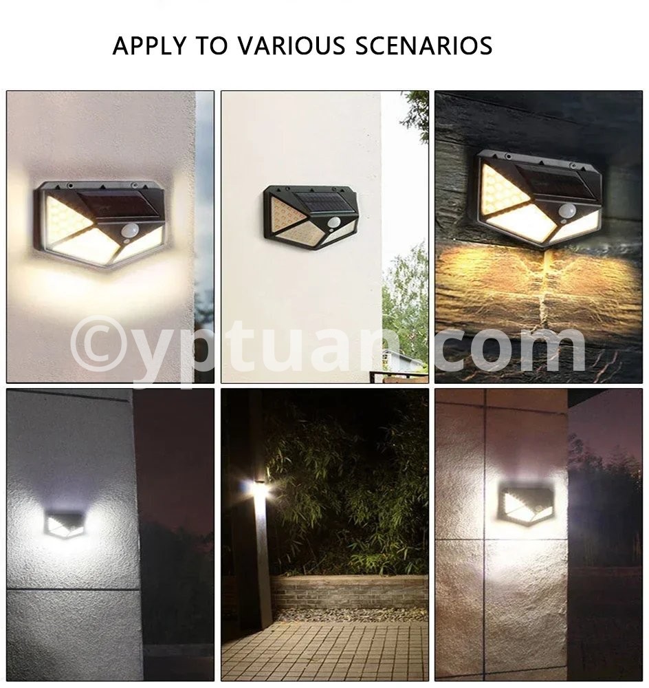 Feature: 1.【More Brightness with 100 LEDs 】Our outdoor solar motion sensor lights with 100 LED sources that provide a brighter, more powerful lighting solution that will illuminate an area instantly and remain brighter for longer. 2.【270° Wider Illumination Angle】This led solar lights provide lasting solar powered brightness that extends across a surface area of 270° offering the biggest illumination than competitors. Save money, add to the security of your home in an energy and enviro-friendly way. 3.【More Sensitive with PIR technology】Our solar motion lights featured the outstanding PIR technology that allows motion detection functionality at a distance of up to 3-5 metres across a wide angle of 120° in a quick response time. 4.【3 Intelligent Modes】The 100 LED Solar Light have 3 Modes, you can choose the perfect mode according to your diverse needs. Medium light mode, Dim light sensor mode and sensor mode. 5.【Easy Installation】Just hang or use screw to mount this Solar Lights in any ideal place with sunlight. 6.【Waterproof IP65 and Heatproof】The 100 led Solar Motion Sensor Light is great for wall, patio, garden, porch, lawn, pathway, Driveway , gutter, etc.. It's specifically designed to withstand extreme weather conditions. Specification: Item type: Outdoor Solar Light LED: 100SMD2835 1W/PCS Material: PC+ABS Solar panel specifications: polysilicon 5.5V 1.43W Battery specification: 18650 lithium battery 3.7V 1800MAH with charge and discharge protection Charging time: 8 hours in the sun PIR sensing angle: 120 degrees Sensing distance: 6-8 meters Waterproof Level: IP65 Product size: 13.5*9.7*5CM 3 Intelligent Modes of Solar light: 1. Medium Light Mode: - The solar light will charge in the day, Auto turn on to continuous bright light in darkness or at night. 2. Dim Light Sensor Mode: -The product charges in the day, auto turn on dim light in darkness or at night when no motion is detected; it will turn to bright light when motion is detected and last about 20 seconds; it will turn to dim light again when there is no motion. 3. Sensor Mode -the product charges in the day, auto turn on bright light in darkness or at night when motion is detected and last about 20 seconds; the light will go off when there is no motion. 4.Finally, Light-off Mode - It will be turned off after press the button again. Note: - Before the first use, please make sure the solar light are be charged with sufficient sunlight for 12 hours. - The solar light should be installed in places where sufficient sunshine is available. -The solar panel can charge quicker under strong sunlight. It can not charge or charge slowly under weak sunlight.The charging time depends on the intensity of sunlight. -The light time depends on the power it saved in the day. Package List:(Optional) 1 / 2 / 4 * 100LED Solar Light 1 / 2 / 4 * Mounting Screws 1 / 2 / 4 * User Manual ❤Pay attention:Please pay attention to the number of variant lights before purchase.Thank you!