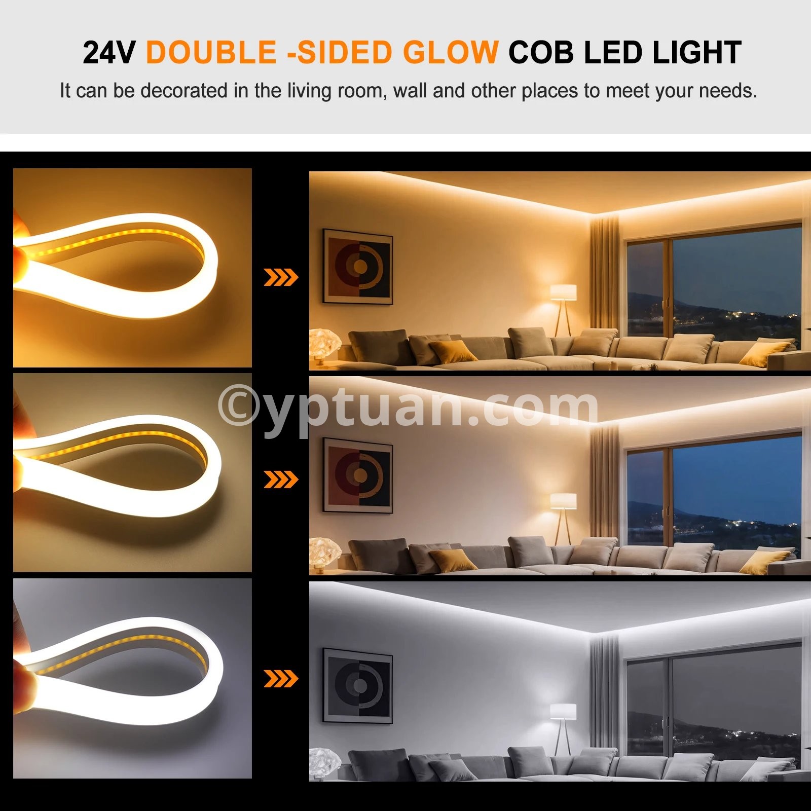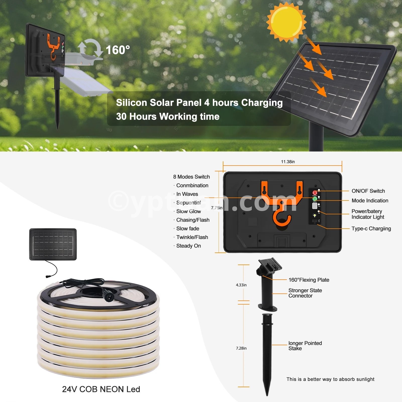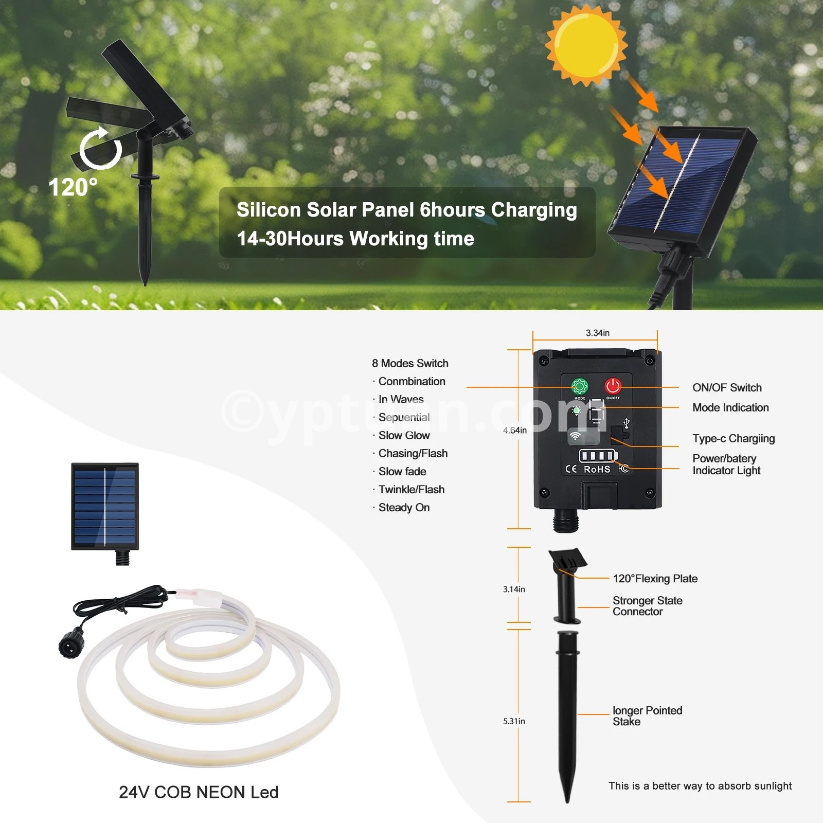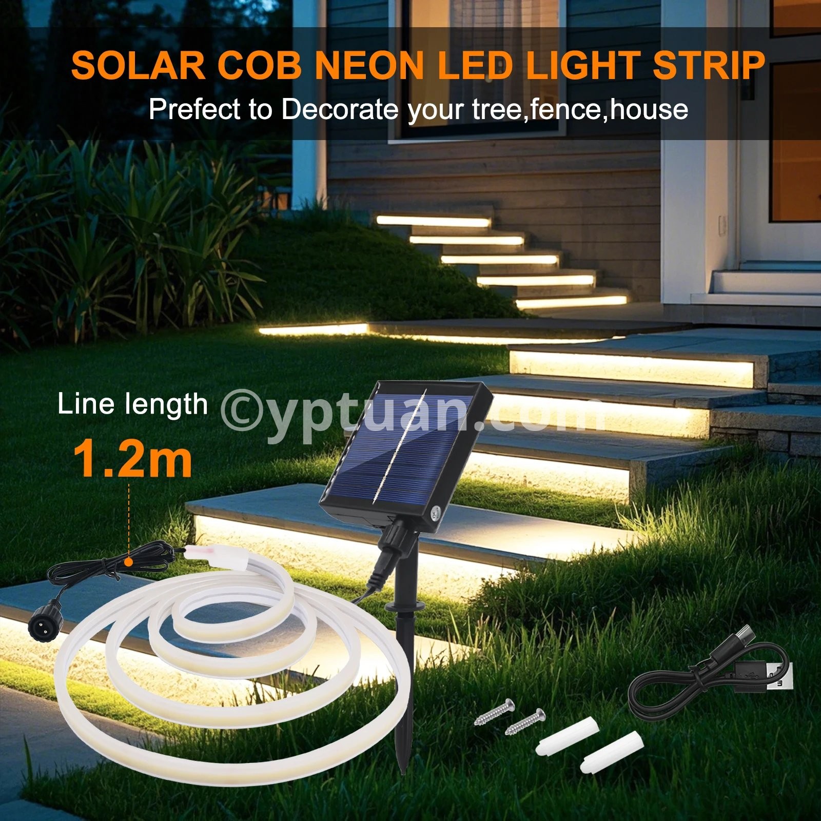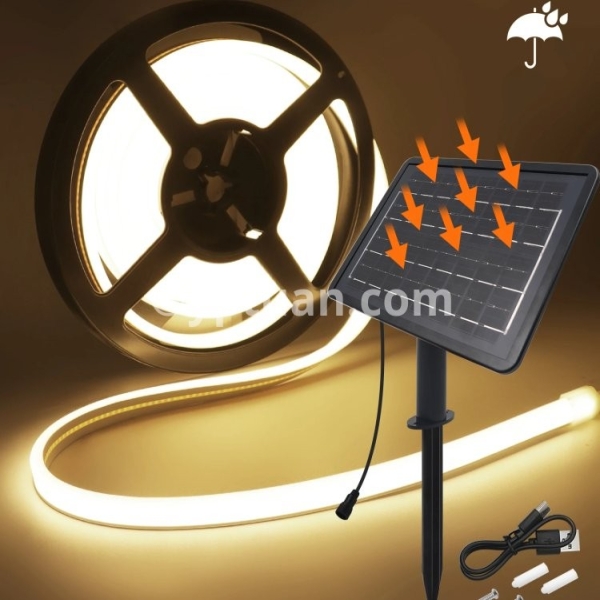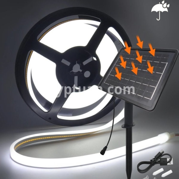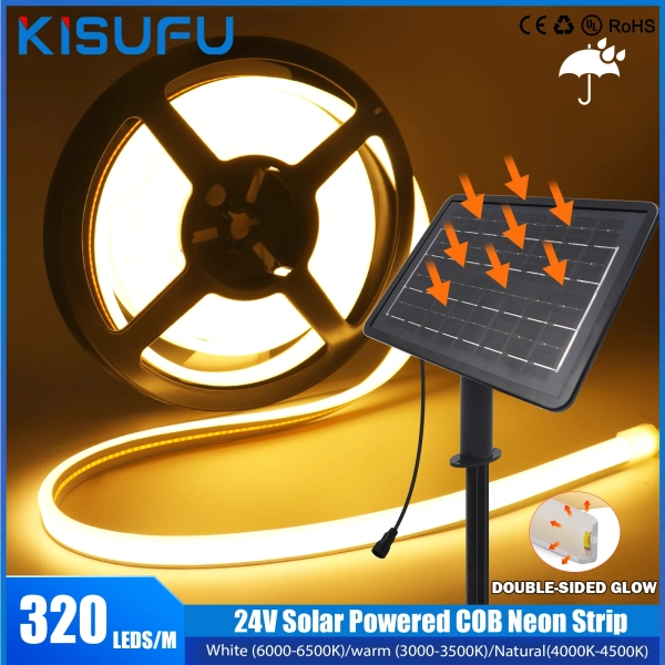 24V Solar Powered COB LED Strip Light Double Side Glow 320 LEDs/m Waterproof Flexible Neon Tape Indoor Outdoor Linear Lighting
