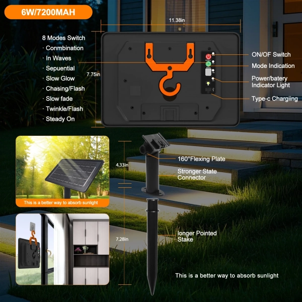 Solar Charging: Place the solar panels in the sun during the day to automatically charge (recommended daily charging)